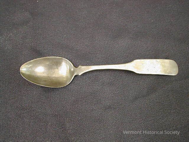 Shortly after the Battle of Bennington, Rhoda Alexander of Westminster went to pick sweet corn for dinner. She was surprised to find a wounded British officer lying in the field. He had fled from Bennington and ended up at her farm. Her family hid him for three months while nursing him back to health. This was a dangerous act, especially considering that Rhoda’s brother, Philip, was a Green Mountain Boy. The officer eventually made his way to Canada. To thank Rhoda, he gave her a pair of silver shoe buckles. Rhoda’s daughter, Annie Cole, inherited the buckles. Annie’s husband, Zackeus Cole, was a Westminster silversmith. He made the buckles into five spoons at the shop of Isaac Eaton who may have been his employer or partner. The spoons were given to the Cole’s children. This is one of those spoons.
