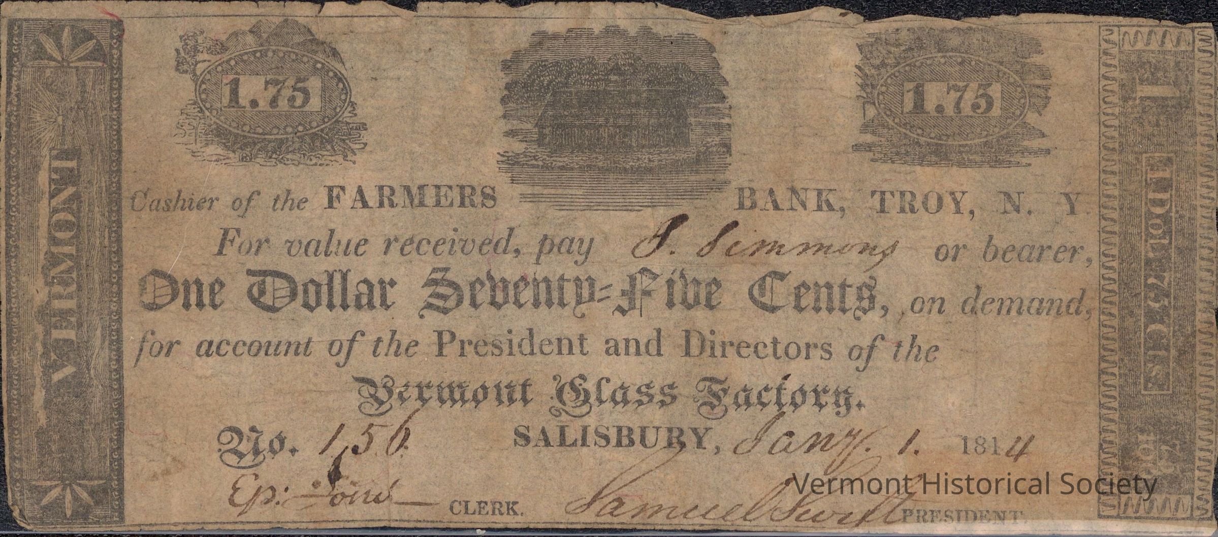 Private bank note for 1 dollar and 75 cents from the Farmers Bank in Troy, New York. It is made out to S. Simmons (or bearer), to be paid from the account of the Vermont Glass Factory of Salisbury, Vermont. The serial number is 156. It is dated January 1, 1814. It is signed by Ep: Jones (cleark) and Samuel Swift (president).