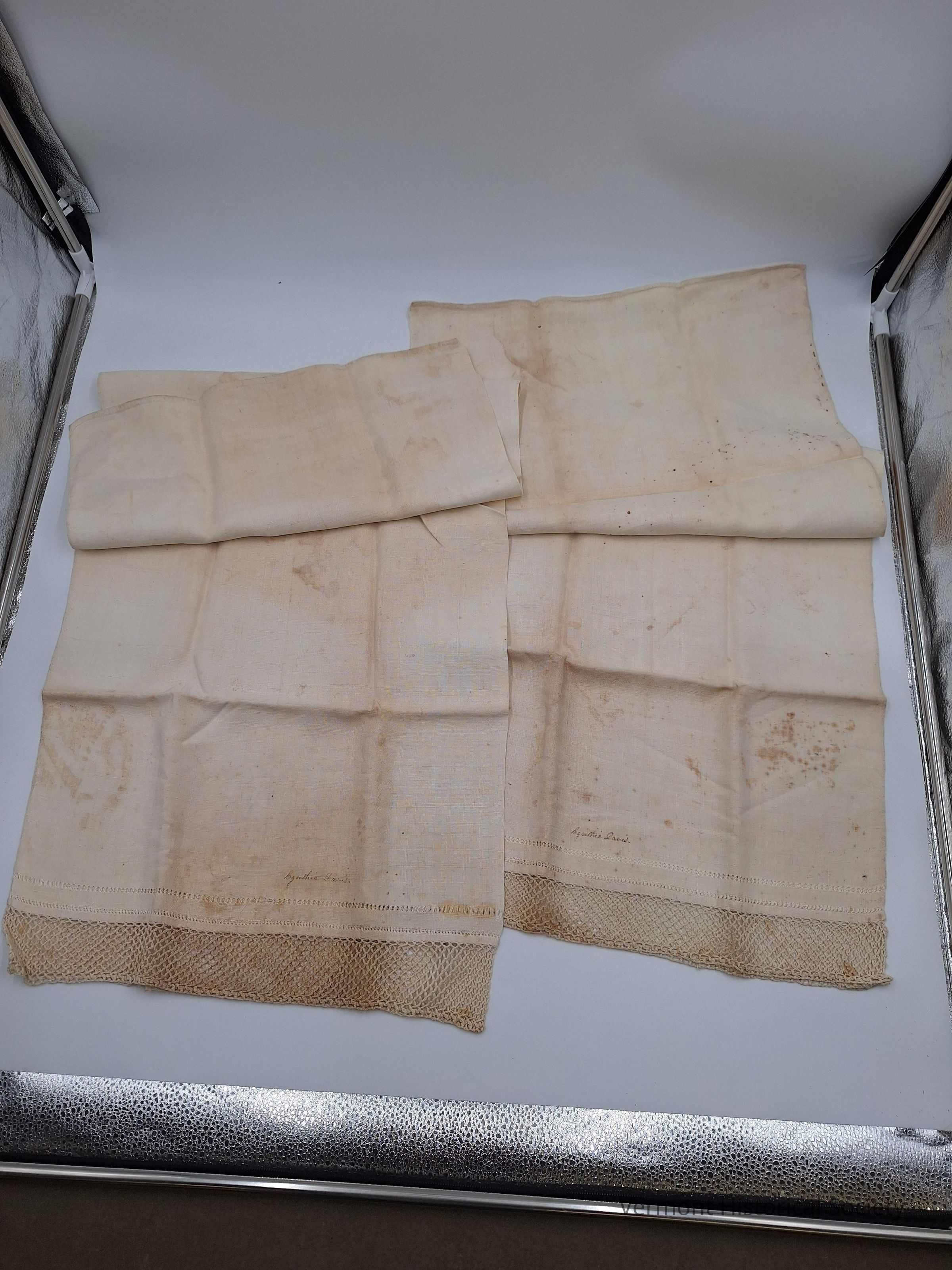 Pair of linen pillowcases woven by Mr. Lorenzo Davis's mother and presented to him when he was married in 1844. A note that accompanied the gift reads, "April 18, 1934. These pieces of linen were made from flax raised on the farm in Vt. as far back as the year 1800 and spun + woven by Cynthia Hand Davis' (my mother) relatives. I can remember seeing them in use when I was a little girl at home but now they are badly worn and no good only for keepsakes in memory of those who have gone on before. Mrs. Lucy Davis Evans, age 81 yrs. 8 mo.Acquisition