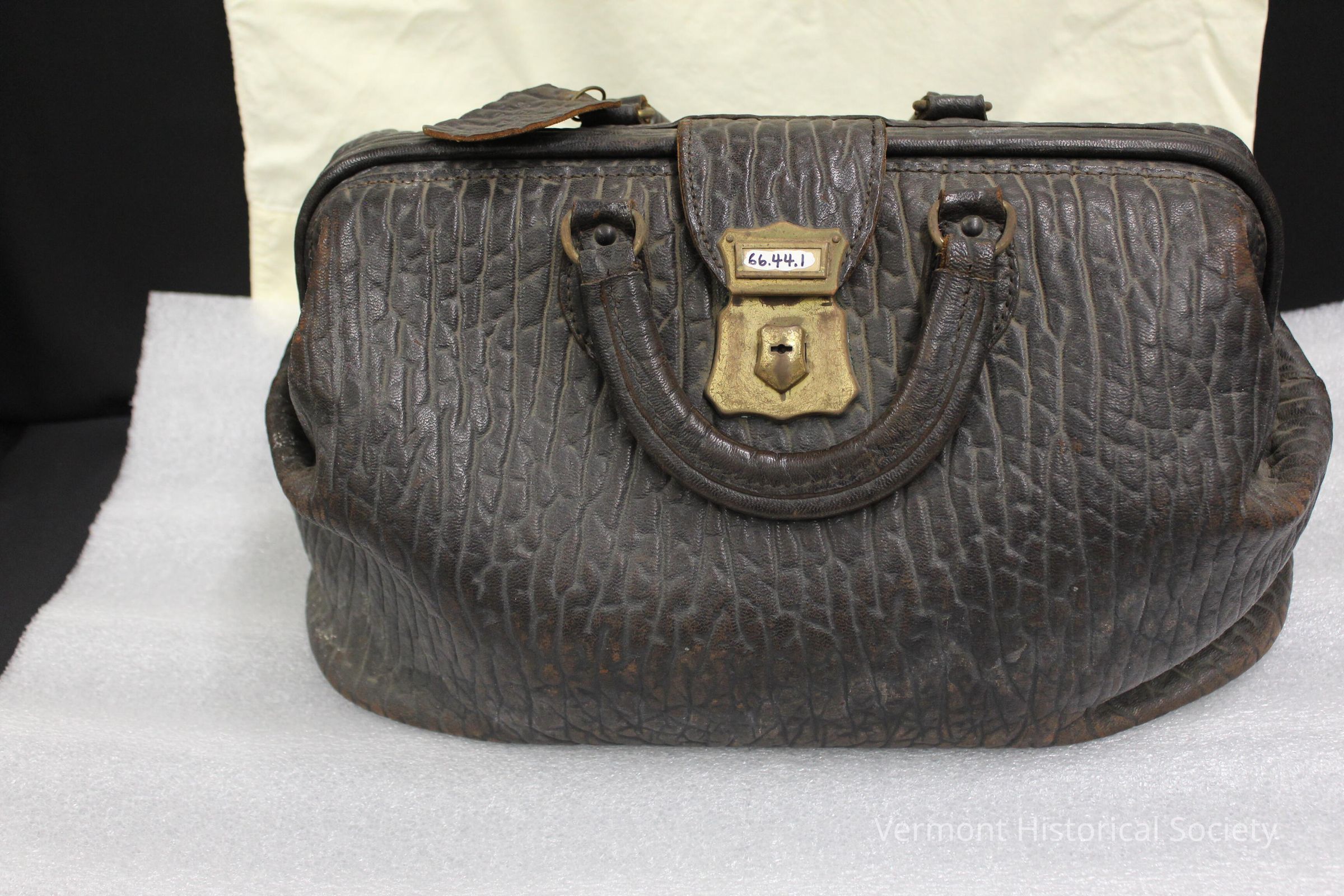 Black leather doctor's bag with short handles and brass clasp. The bag contains paper envelopes, glass vials, glass bottles, and a metal tube filled with various drugs.
