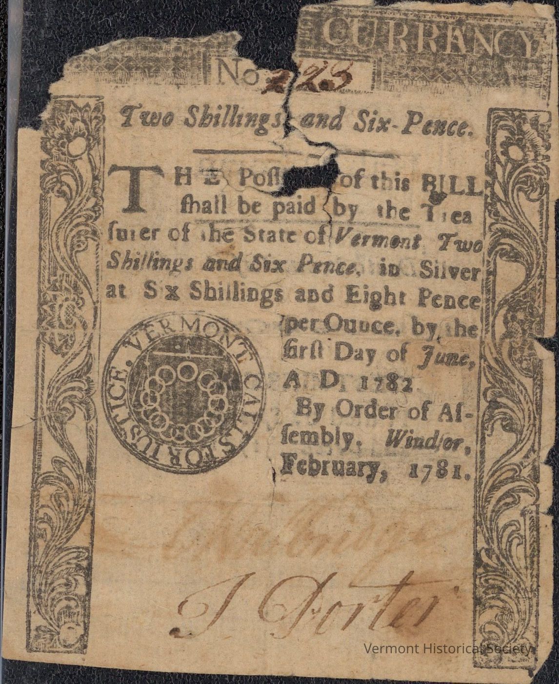 Paper money for 2 shillings and 6 pence. The serial number is 223. One side has the inscription, "The possessor of this BILL shall be paid by the Treasurer of the State of Vermont Two Shillings and Six Pence, in Silver at Six Shillings and Eight Pence per Ounce, by the first Day of June, A. D. 1782. By order of Assembly, Windsor, February, 1781." It is signed E. Walbridge and T. Porter. The other side is printed with the inscription, "Half Crown / Death to counterfeit. / WESTMINSTER: Printed by Spooner and Green. 1781." and signed Timothy Bush.Acquisition
