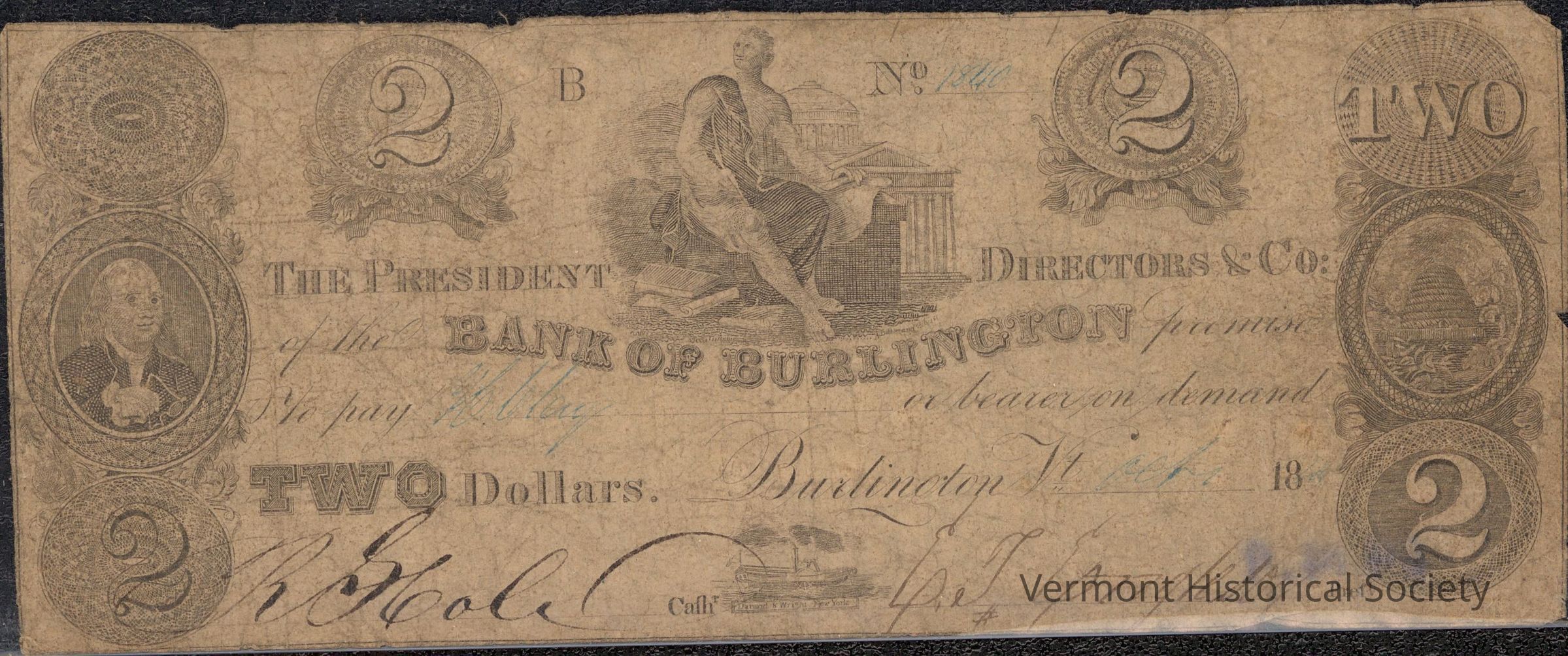 Private bank note for 2 dollars from the Bank of Burlington. It is made out to H. Clay (or bearer) in blue ink. It is dated Oct. 1, 1814. The serial number is 1840.