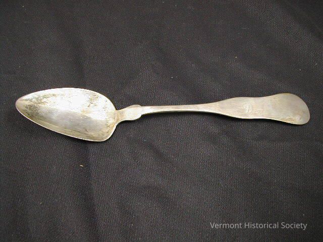 Large silver tablespoon with a fiddle handle. The back is marked, "H.M.NICHOLS."