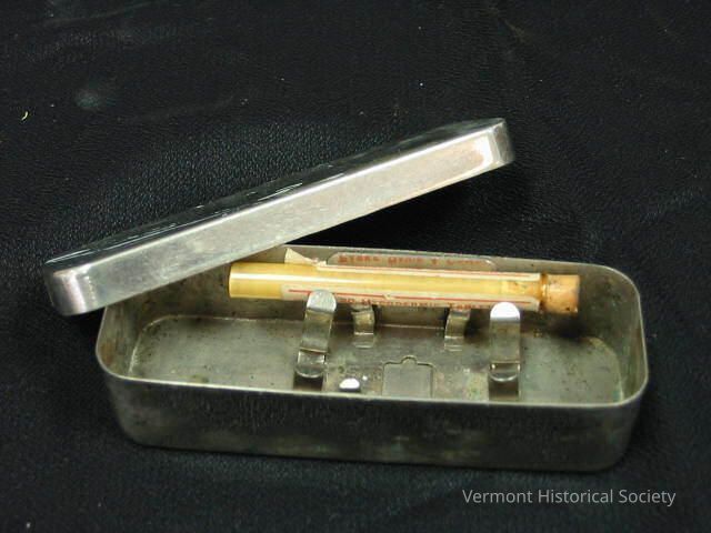Small rectangular tin case. The interior of the case has 6 metal tines, shaped to hold cylindrical vials. One cylindrical glass vial is present and filled with yellow powder (sealed with cork). A paper label on the vial reads, "20 Hypodermic tablets No. 70 Strychnine Sulphas".