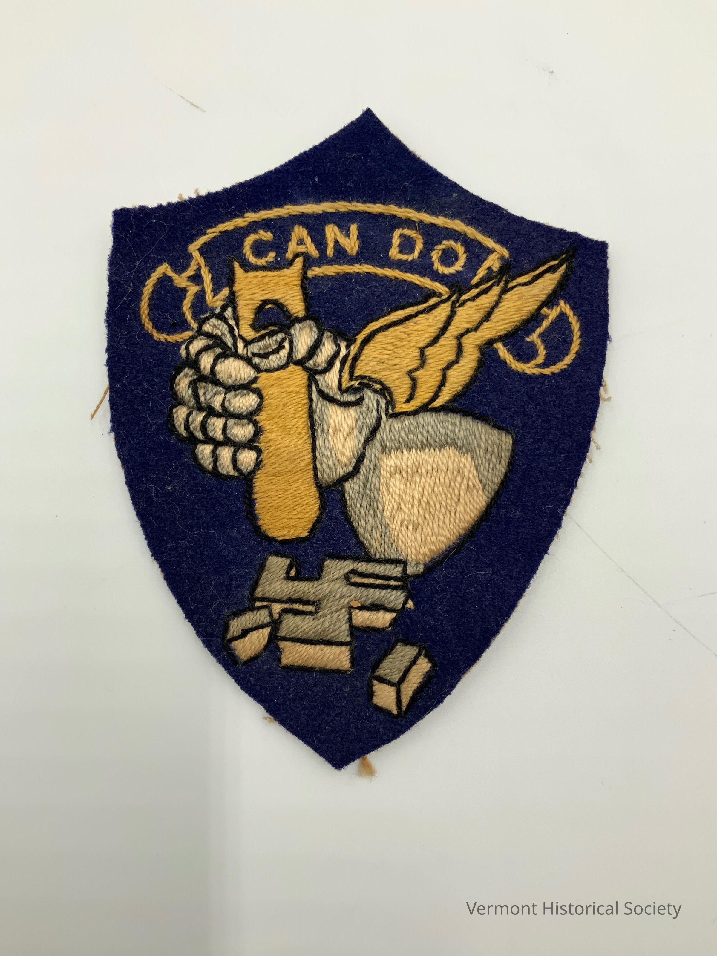 Shield-shaped insignia patch showing an armored hand holding a missile and using it to break a swastika. The wrist of the hands has wings. The words "CAN DO" are in a banner across the top.