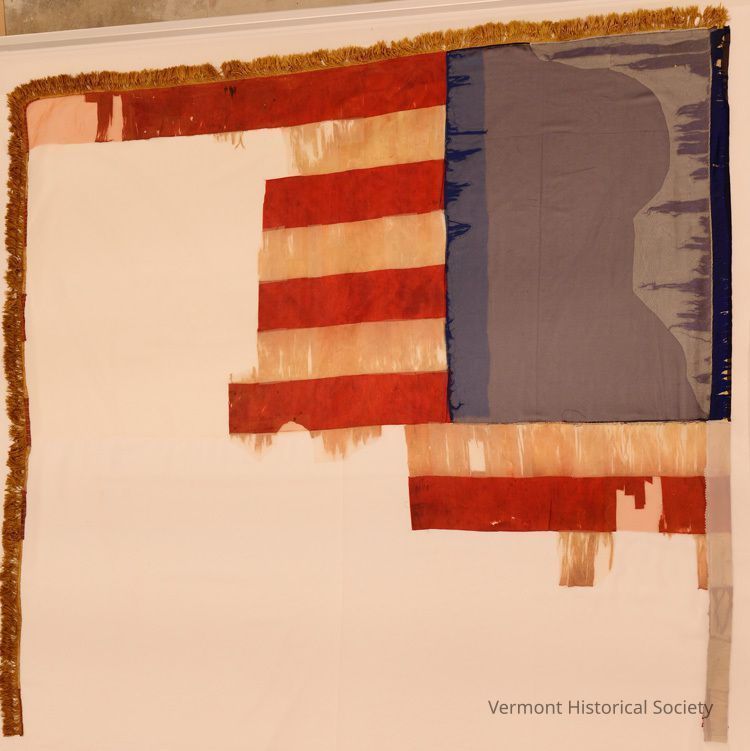 National flag of the 10th Vermont Infantry Regiment. Silk "stars and stripes," with stars painted in gold on blue field.