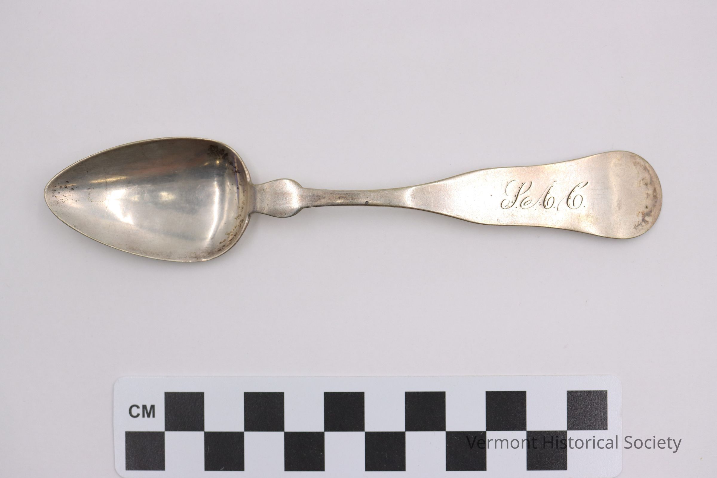 Silver teaspoon with a slightly pointed bowl and rounded shoulders. The handle is engraved with the initials "S.A.C." The reverse is marked "LUDLOW,VT." at the shoulder, and "B.M.BAILEY" on the handle.