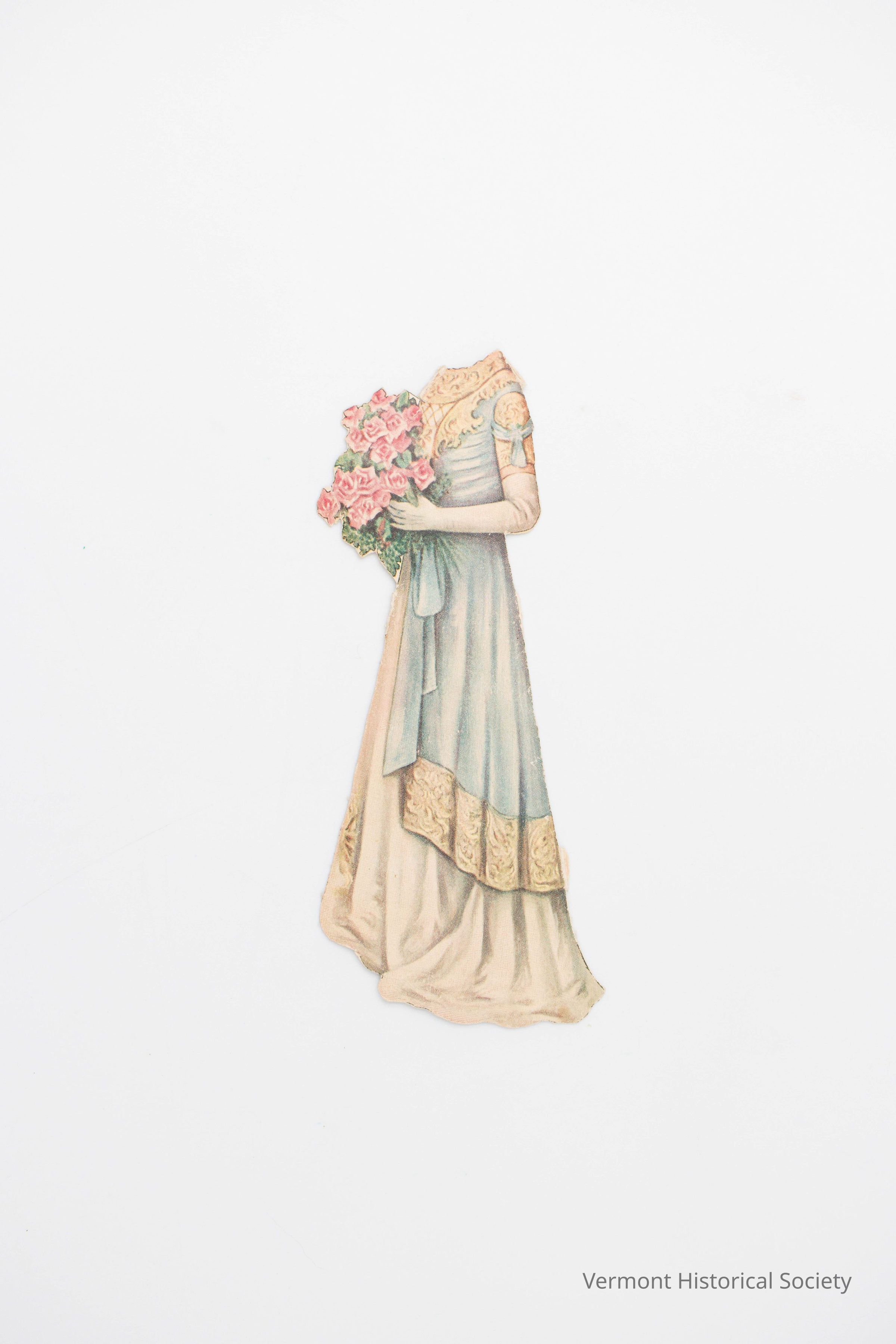 Edwardian-style white light blue dress for a paper doll. It is seen from the side and the arms are holding a large bouquet of pink roses.Context