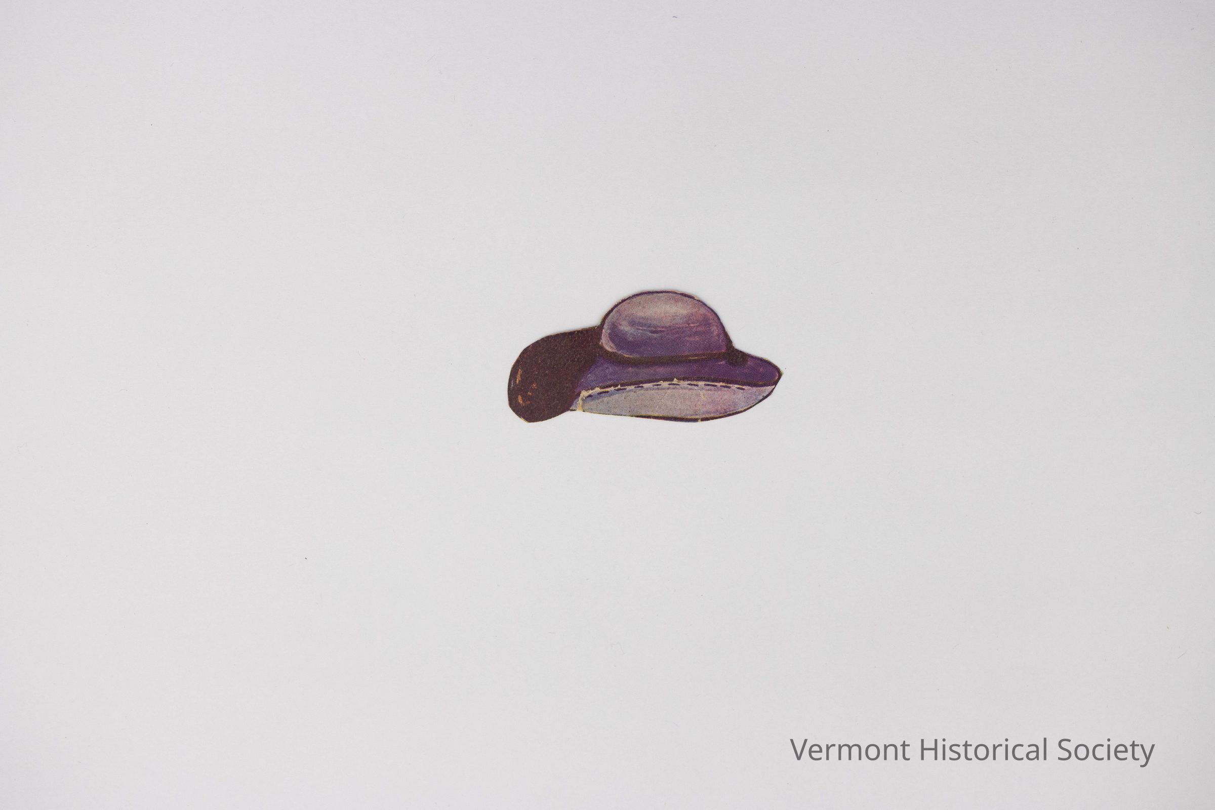 Printed paper hat for a paper doll. The hat is purple with a wide brim. The back shows a portion of a page of a magazine.Context