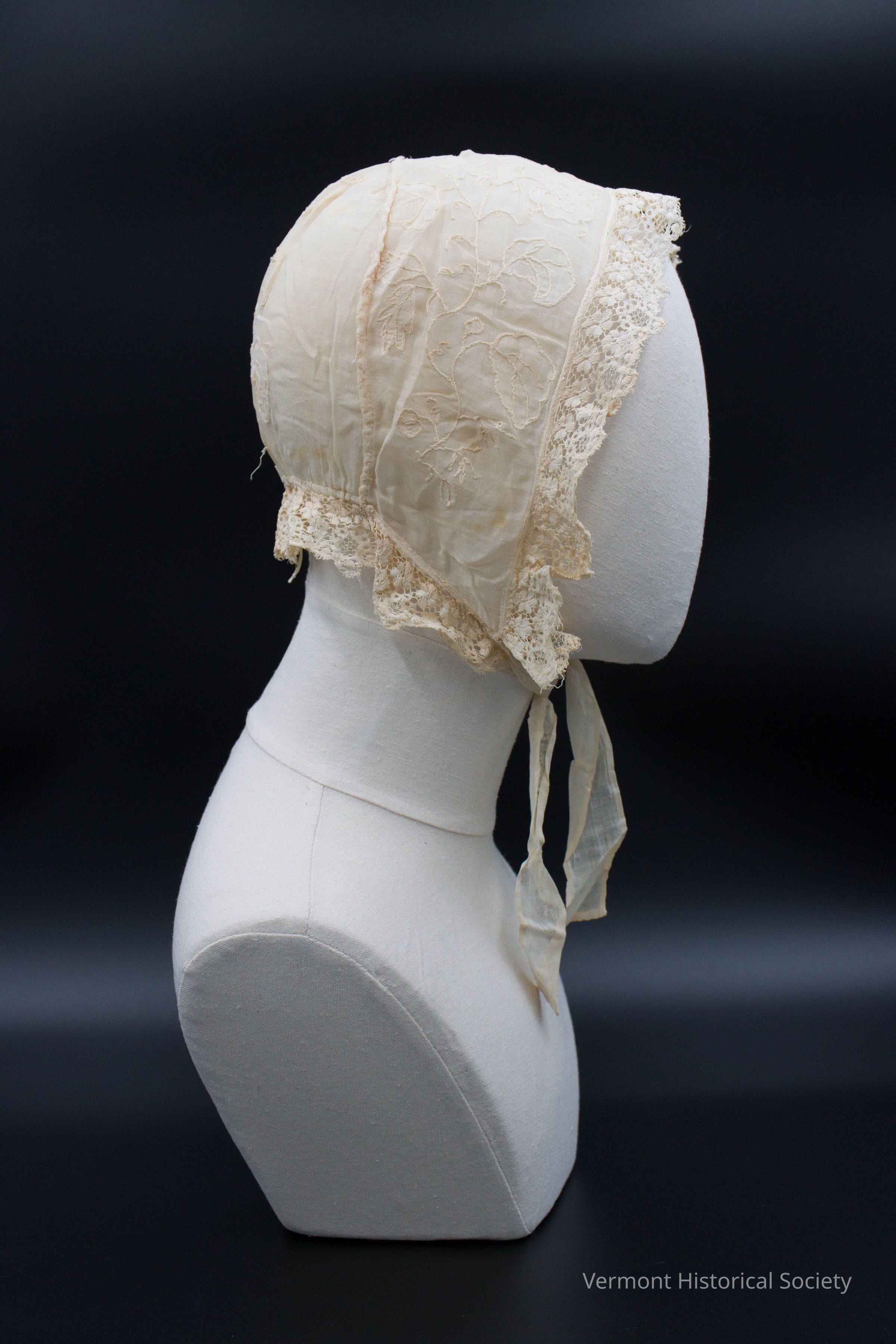 Semi-sheer white cotton cap constructed in two parts: the caul and the brim. The caul is gathered at the base of the neck, creating very slight fullness. Both pieces are embroidered with white thread in a pattern of leafy vines. The edge is trimmed with machine-made lace with a floral pattern. There are white cotton ties attached to each corner of the cap.Context