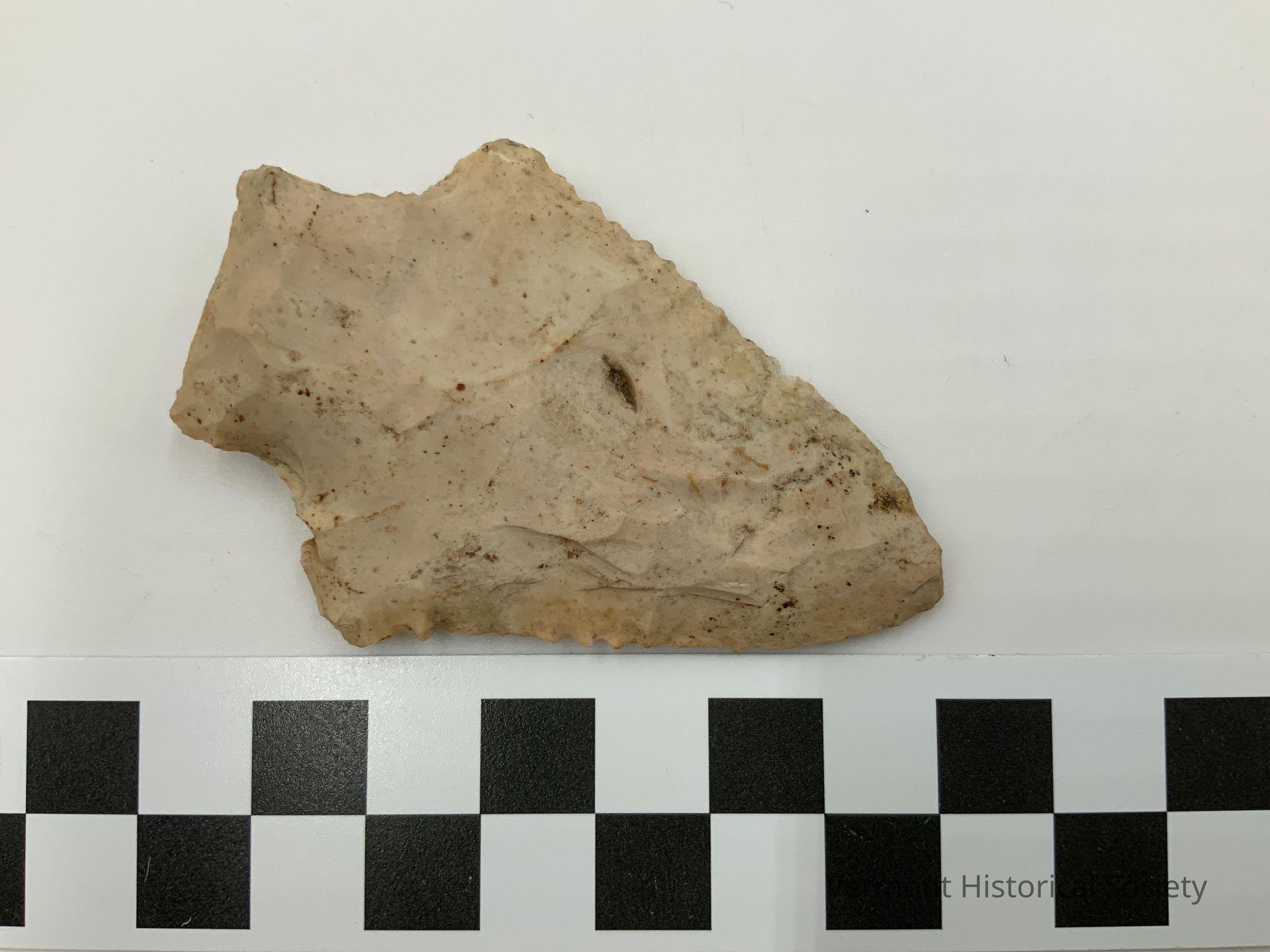 Tan colored chipped stone projectile point with a straight stem.