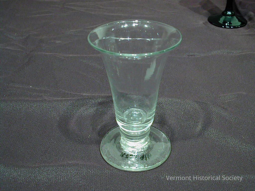 Clear glass wine glass. The cup sits on a low stem with a circular base. The body flares outward toward the top, and the rim is curled outward.