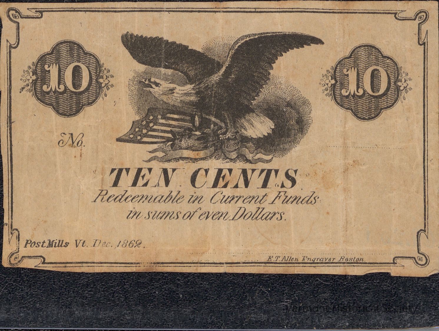 Private bank note for 10 cents. The bank is is not identified, the serial number is blank, and it is unsigned. It is dated Dec. 1862 from Post Mills, Vt.