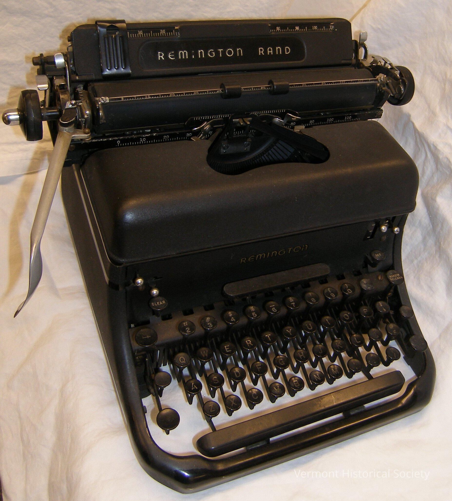 Black typewriter with the label "REMINGTON RAND" at the center top. The typewriter has round, black keys marked with gold letters and numbers, plus unmarked shift keys and keys for tab, Margin Release, Set, and Clear.Context
