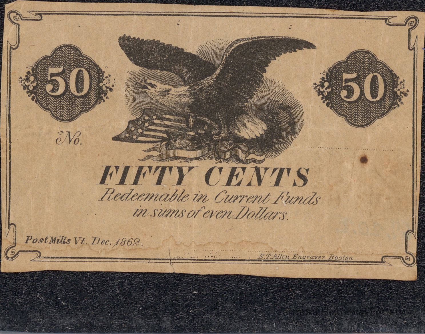 Private bank note for 50 cents. The bank is is not identified, the serial number is blank, and it is unsigned. It is dated Dec. 1862 from Post Mills, Vt.