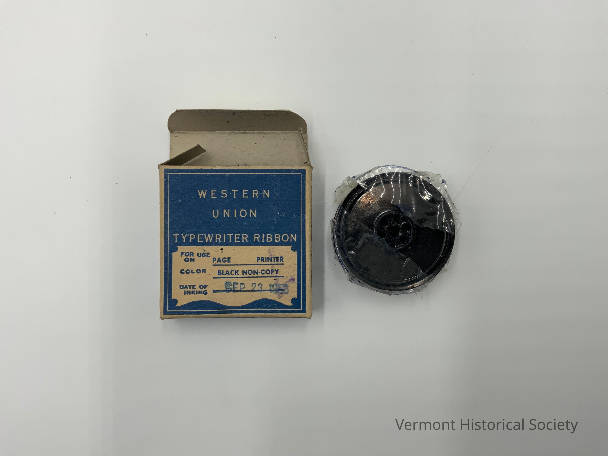 Unused typewriter ribbon and box. The ribbon is on a black plastic spool and wrapped in a thin, cellophane case (torn). The whole is stored in a blue-and-white cardboard box labeled with manufacturing information.Context