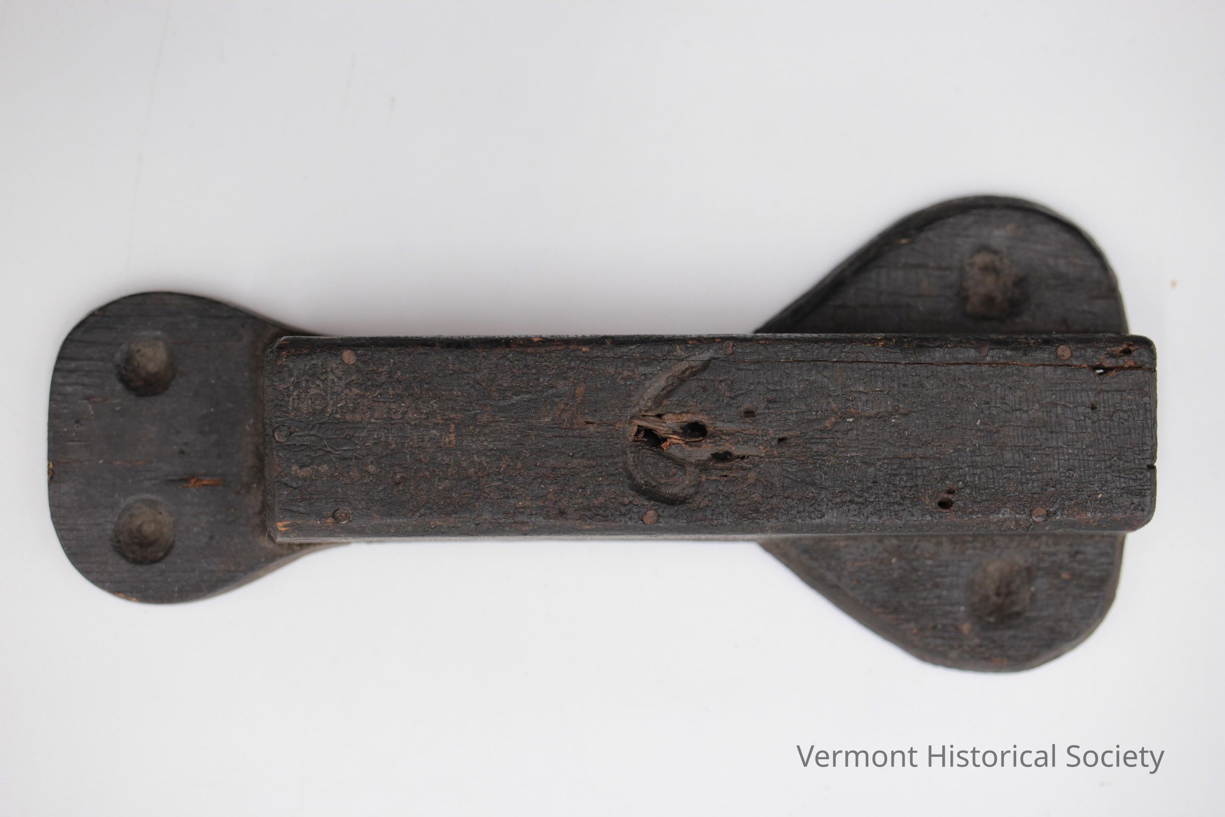 Wooden pattern consisting of a central rectangular box with winged sides.