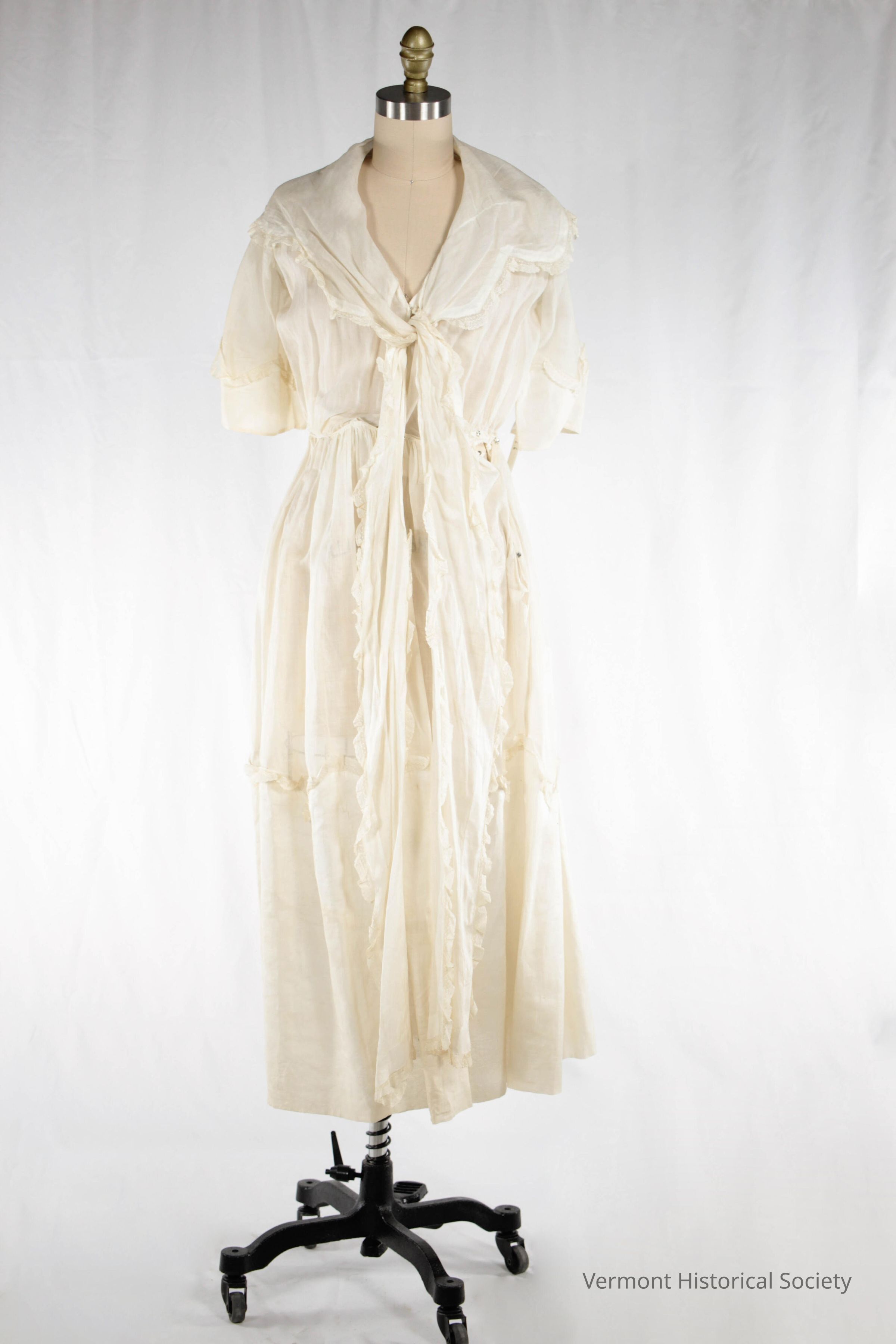 A white linen dress with lace trim. It has a wide sailor collar that ties at the center front. It has short sleeves, and the waistline hits at the wearer's natural waist.