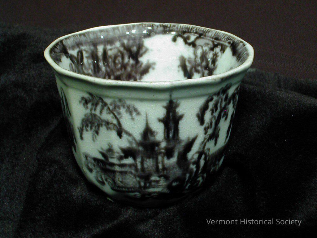 Transfer-printed handless teacup. The design is printed in black and features pagoda-style buildings and trees. The print is smudged and running.