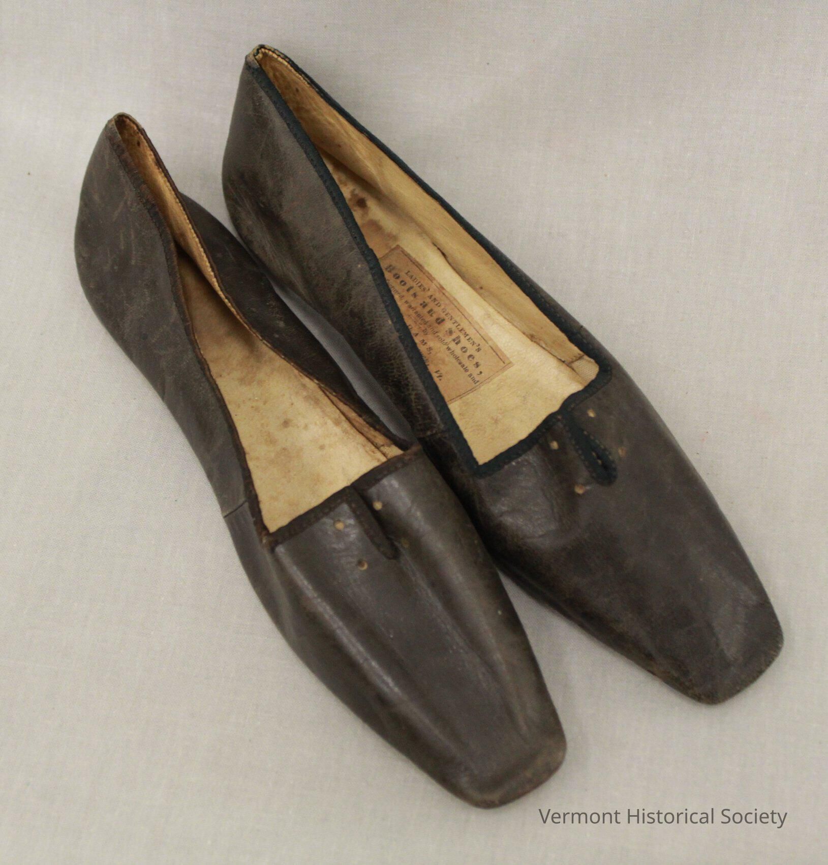 Black leather flat-soled shoes with squared-off toes. The interior is lined with white linen, and there is a paper label on one insole that reads, "LADIES' AND GENTLEMEN'S BOOTS AND SHOES Manufactured, warranted and sold wholesale and retail by J. Adams, Fair Haven, Vt." The shoes lace at the center top.Context