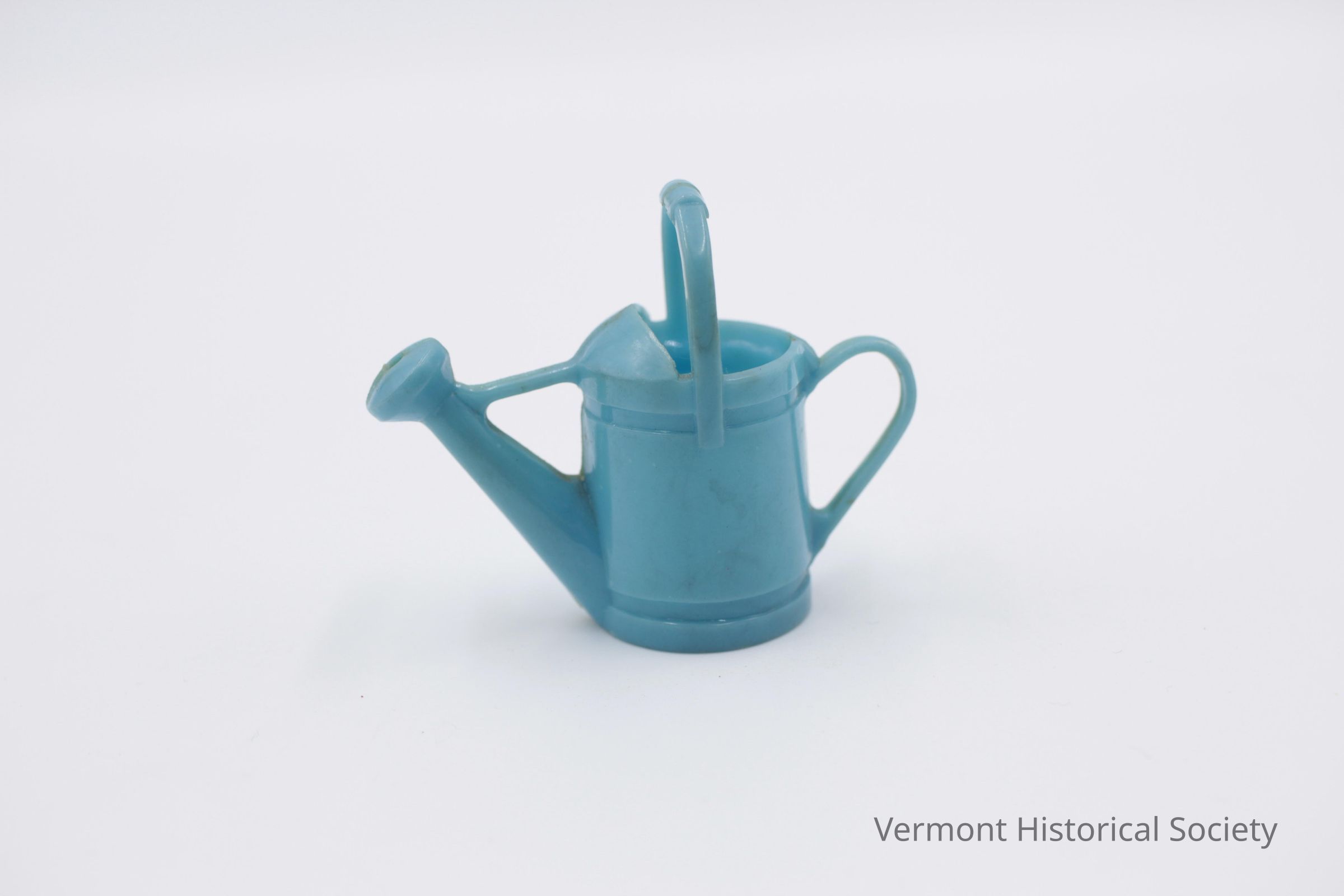 Miniature blue plastic watering can sized for a dollhouse.Context