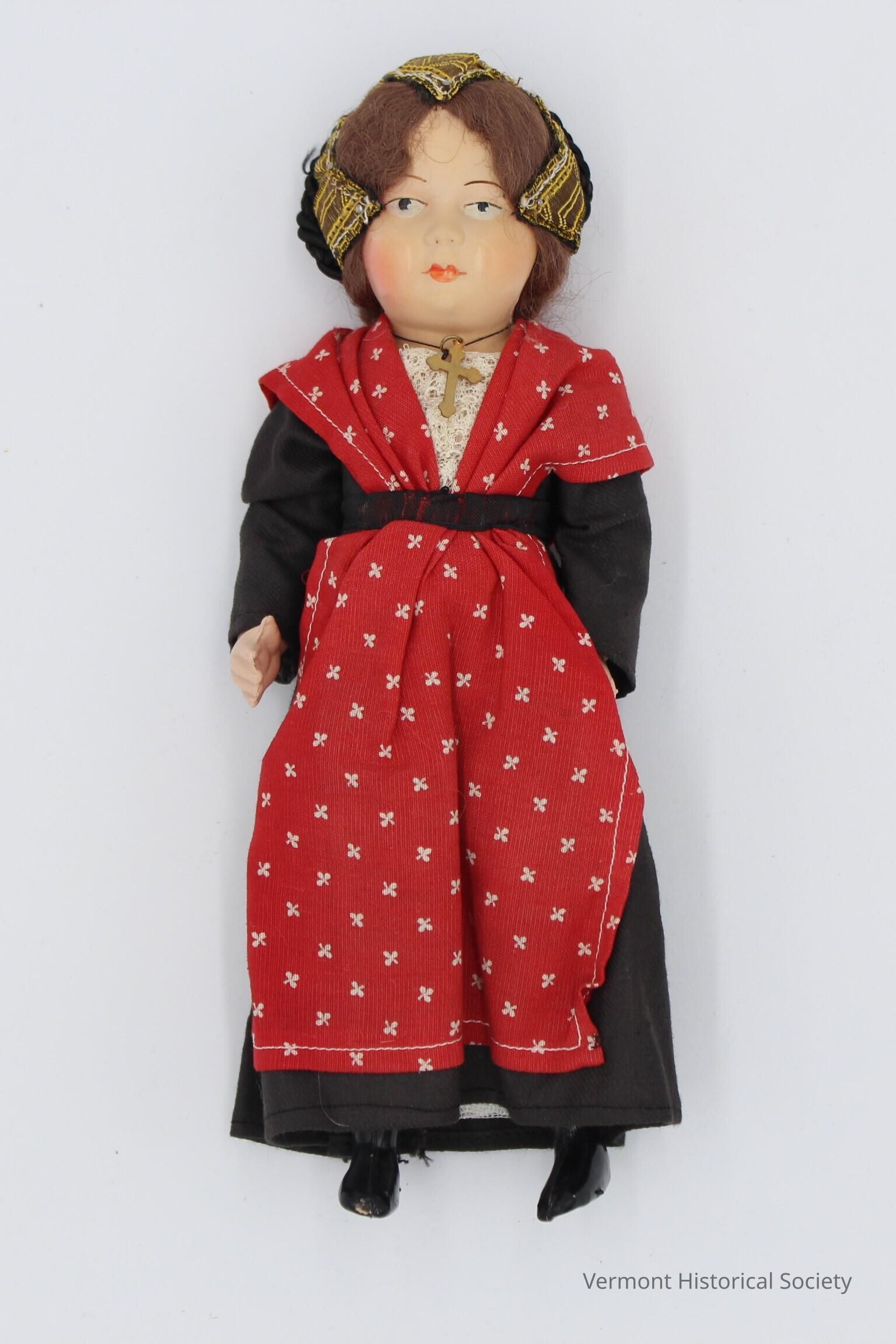 Female doll with brown hair, a soft body, and painted facial features. She is wearing a cap that extends to three point around her face, a black dress with a white bodice insert, and matching apron and fichu in red calico sprigged with white. A gold cross hangs around her neck. She has black shoes.Context