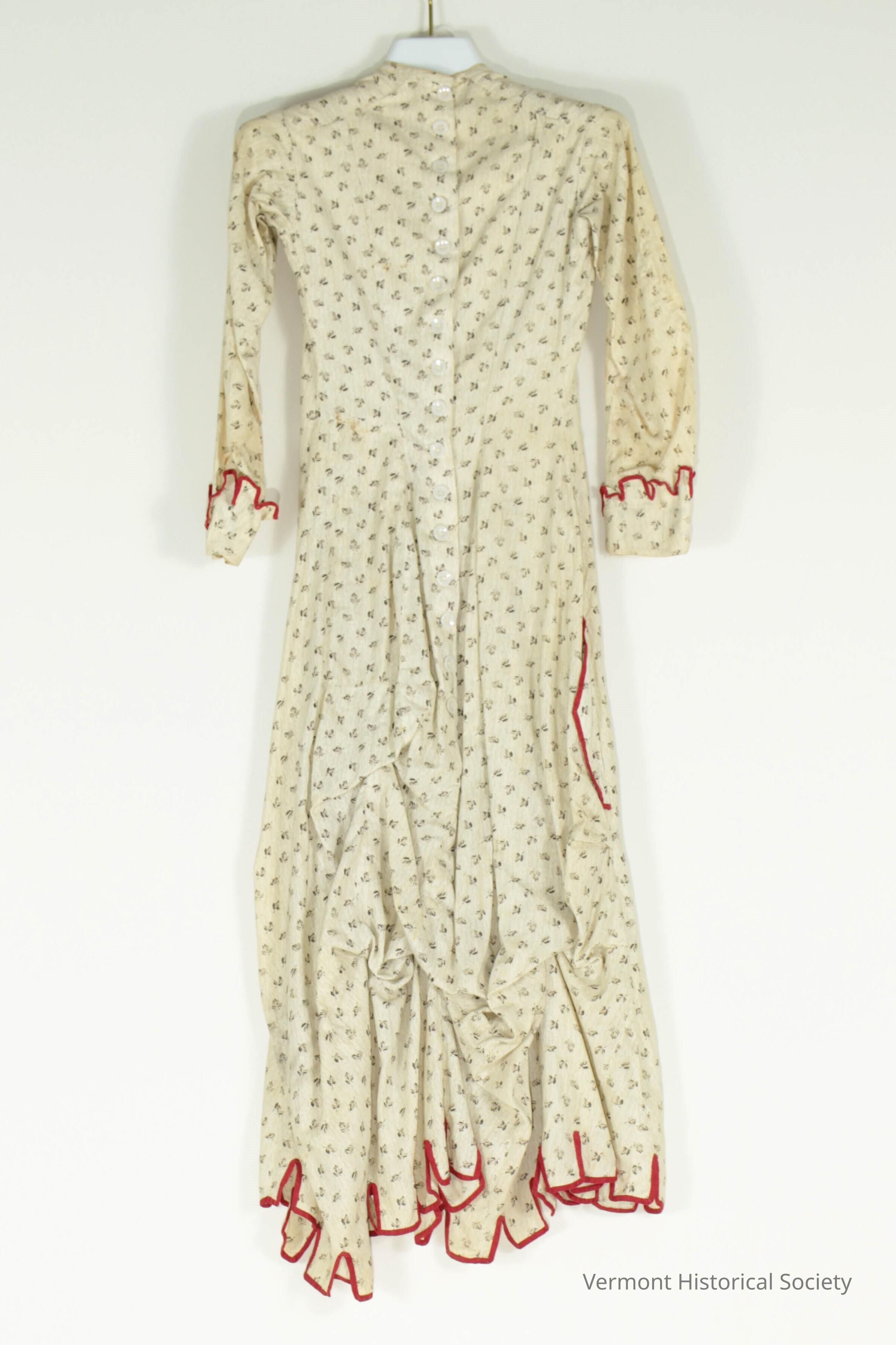 Dressing gown of white cotton printed with an all-over repeating pattern of leaves. The gown opens down the center front and secures with white buttons. The hem and cuffs are fancifully cut in tab and bound with red cotton, as is a pocket set into the side seam of the skirt. The skirt is tacked up in several places, giving it a bustled or draped effect.