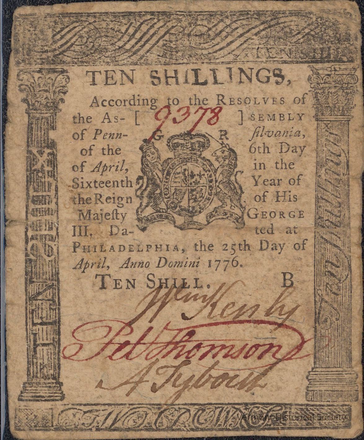 Early American paper money for 10 shillings printed in Pennsylvania. The serial number is 9378, which is written in red.