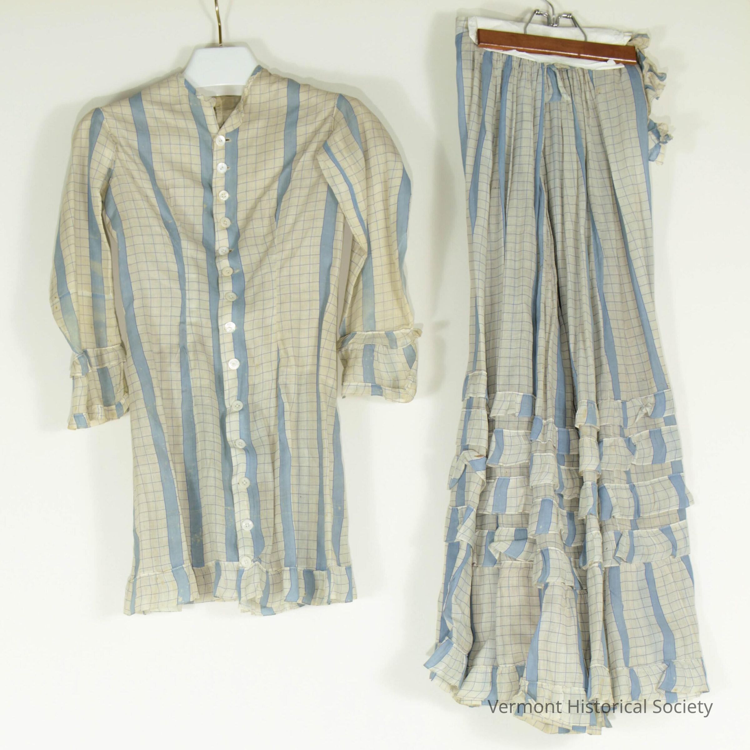 Two piece dress of semi-sheer cotton consisting of a blouse or jacket and a skirt. The fabric is woven in a pattern of window-pane checks and thick vertical stripes. It opens at the center front and secures with 15 white buttons. It has a separate collar or necktie. The 3/4-length sleeves are trimmed at the cuffs with self fabric, as are the hems of both the blouse and skirt. The bottom half of the skirt is trimmed with four self fabric flounces.Context