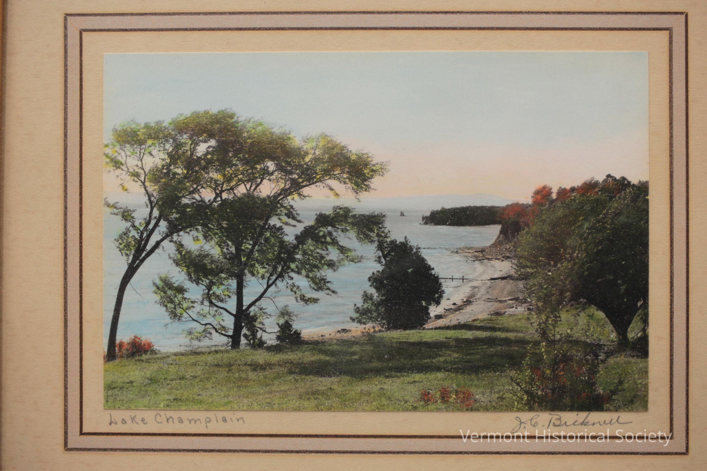 Framed photographic postcard showing a shoreline with grass and trees in the foreground. The card is mounted onto a matboard and labeled, "Lake Champlain", at the bottom left. It is signed, "J. C. Bicknell" at the bottom right.