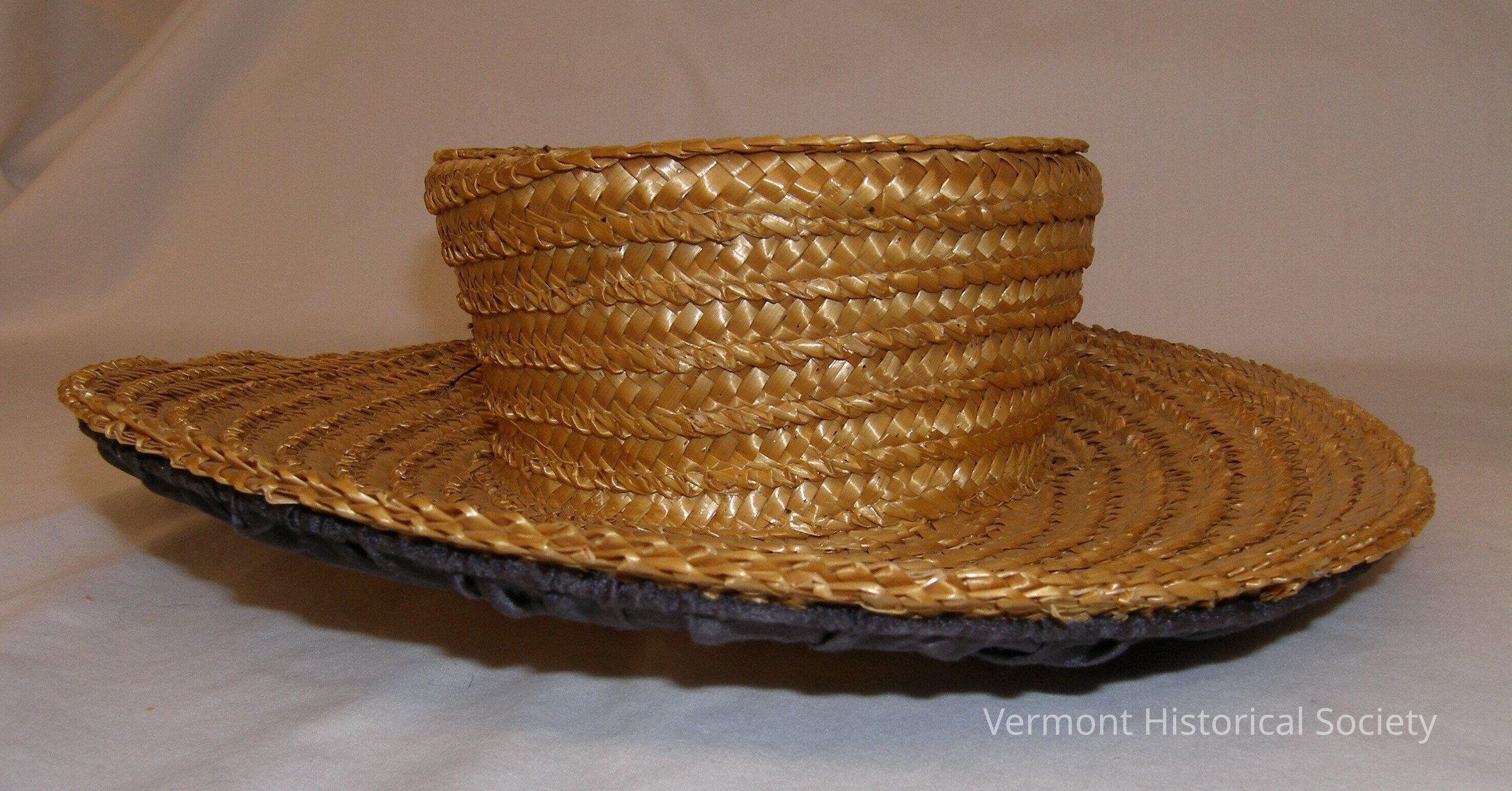 Flat-topped and brimmed hat made from plaited straw. There is ruched satin ribbon around the underside of the brim that does completely line it. The crown is lined with semi-sheer white linen. There are red grosgrain ribbons for securing the hat to the wearer.