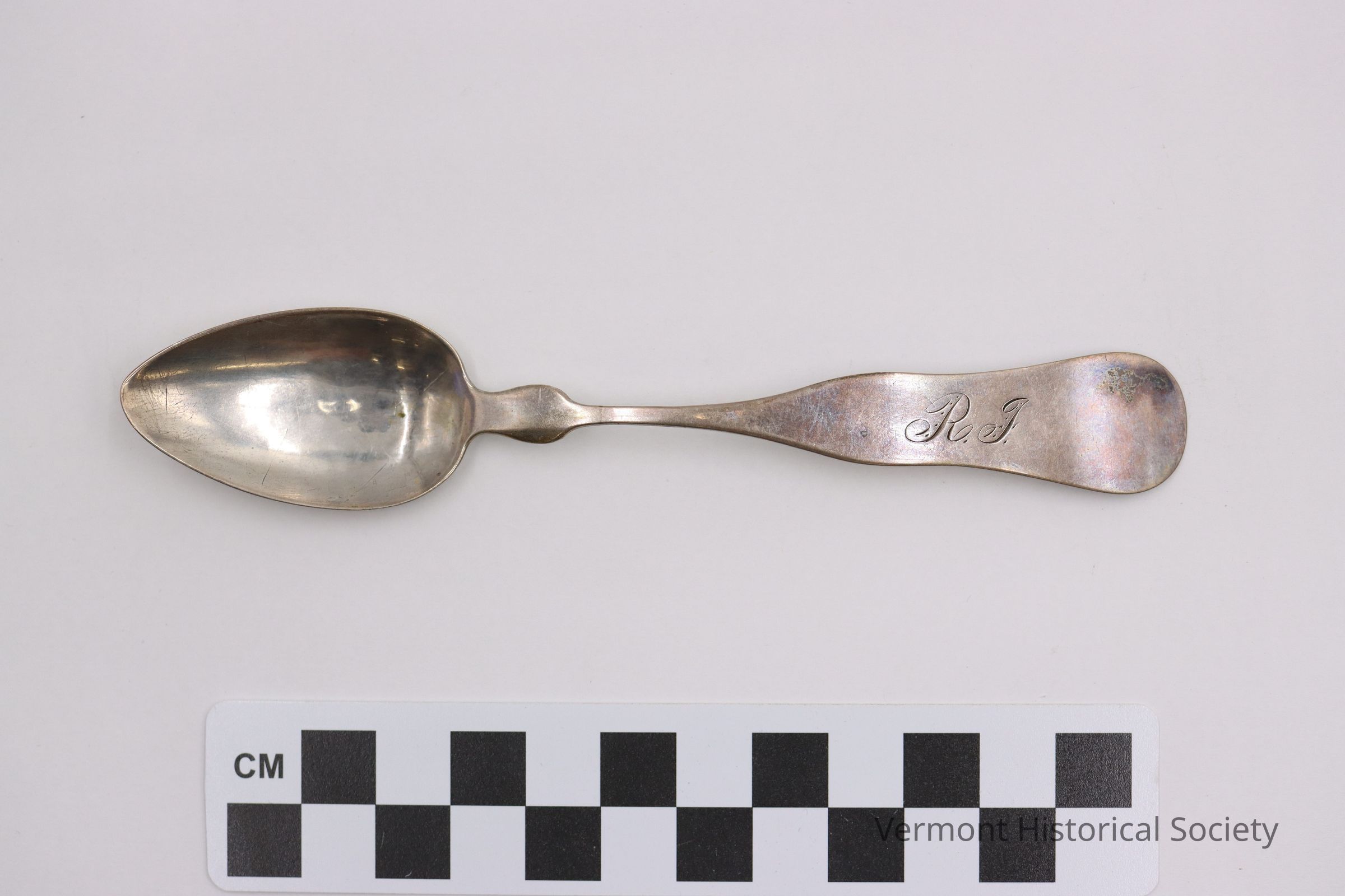 One of a matching pair of teaspoons. The spoon has a pointed bowl and rounded shoulder. The handle is engraved with the initials RF. The back of the handle is stamped with the mark "E.E. &. S.C. BAILEY." within a rectangle.