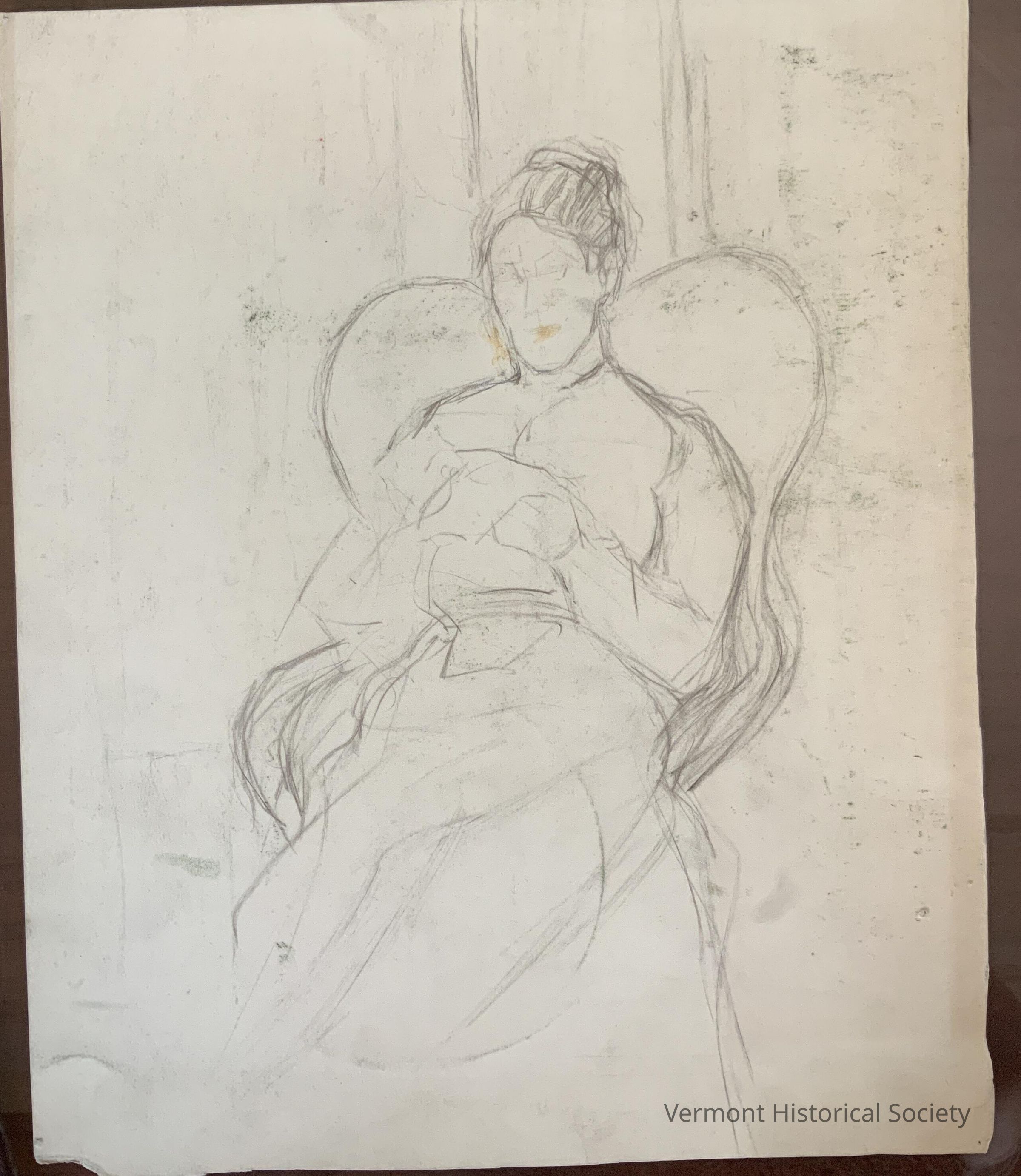 Two rough sketches, one in each side of the paper. One is of a woman sitting in a chair and holding something, possibly knitting. The reverse side is a man and woman sitting at a table together, seen from the side. Both sketches are sparse. Unsigned and undated.Type of Drawing
