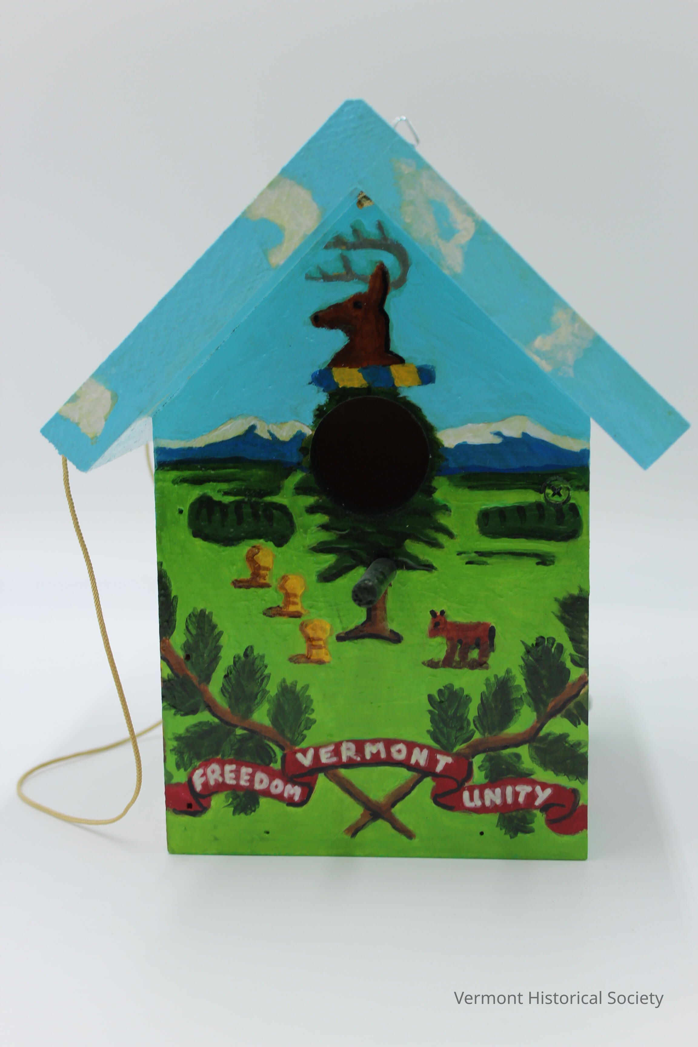 Square birdhouse with peaked roof painted all over with images of Vermont. The front is painted with a stylized version of the Vermont seal, featuring bales of wheat and a cow in a field flanking a tree. The bust of a deer (in the form of a crest) surmounts the opening, and the base is framed with two tree branches and the words "FREEDOM/VERMONT/UNITY" in a red ribbon. A small dowel protrudes out from underneath the opening to act as a perch.