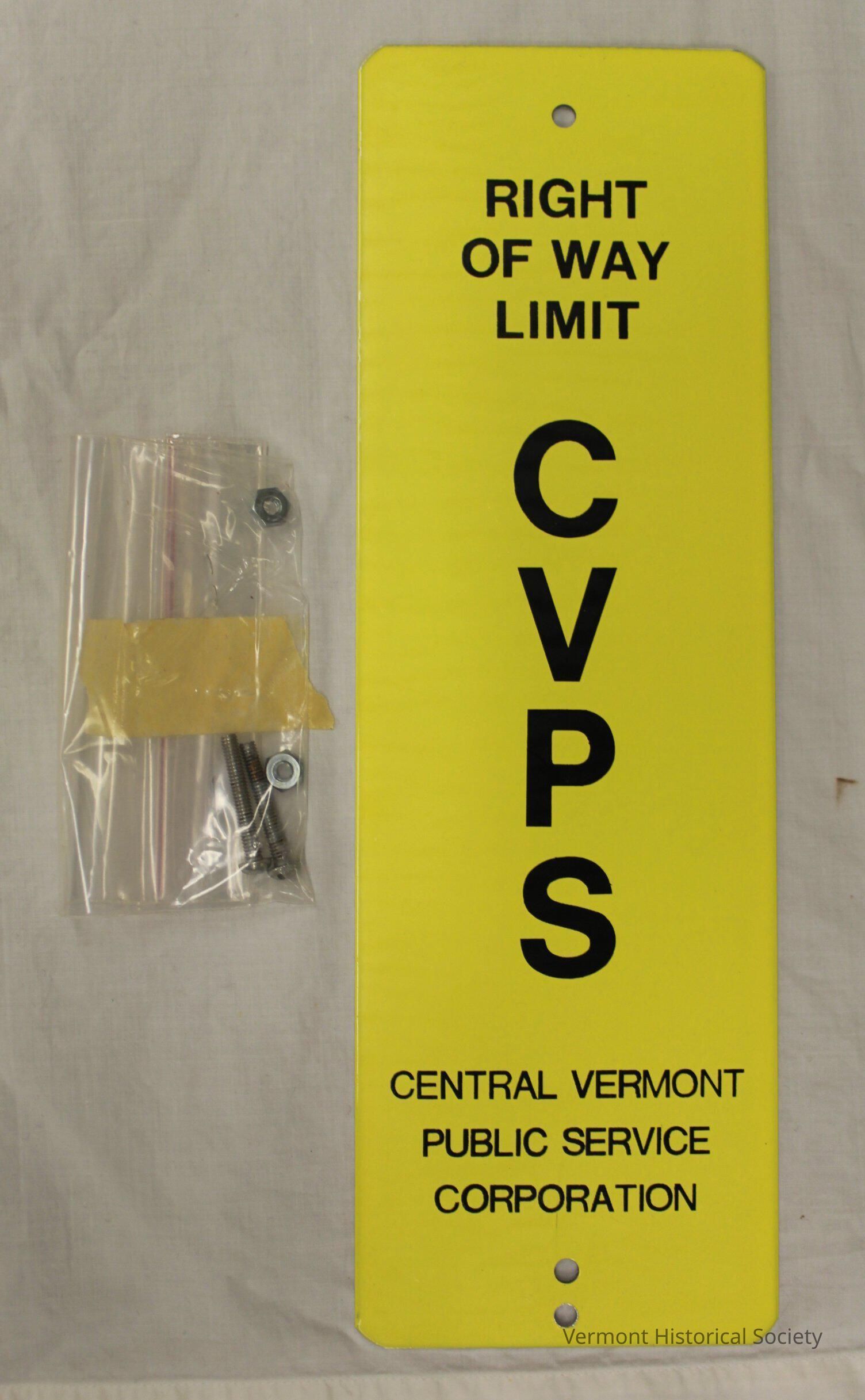 Yellow metal vertical rectangular sign with "CVPS" printed in black vertically down center. Printed above: "RIGHT/ OF WAY/ LIMIT" and below: "CENTRAL VERMONT/ PUBLIC SERVICE/ CORPORATION" At top is one hole and at bottom two holes for attaching sign. There are 4 identical signs and each one has a packet of hardware for installing. The back of the sign is white.