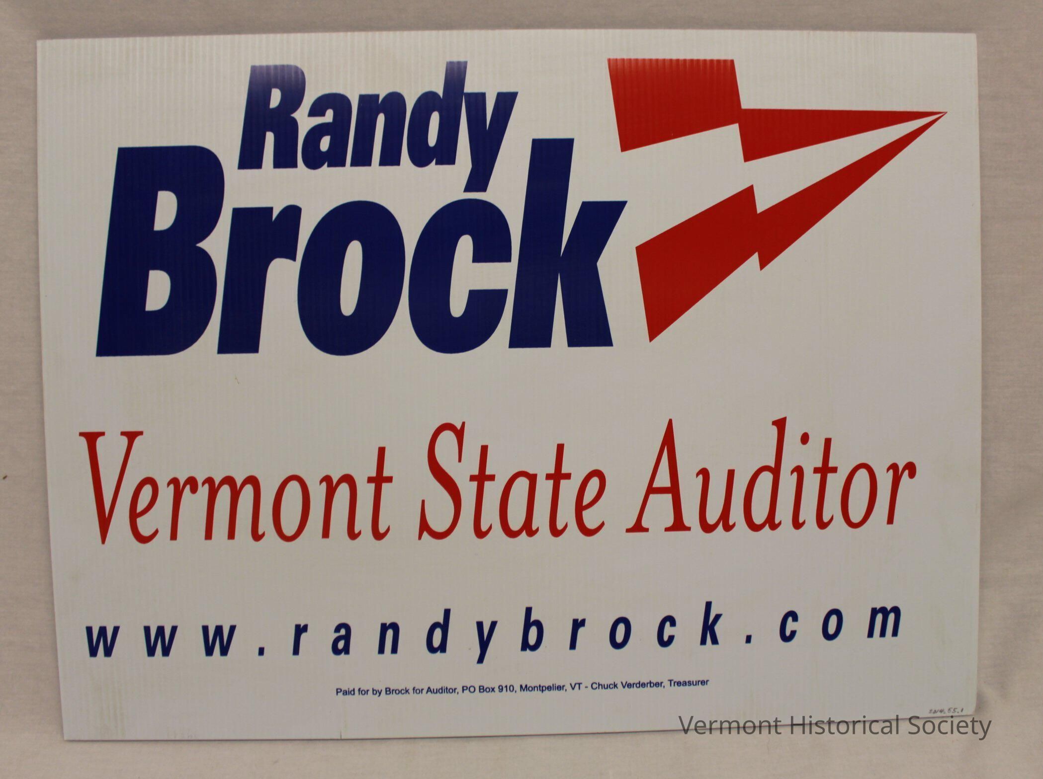 White corrugated plastic sign with the words, "Randy Brock / Vermont State Auditor / www.randybrock.com" in large red and blue letters on both sides. There is a red lightning bolt beside the candidate's name. In small letters across the bottom are the words, "Paid for by Brock for Auditor, PO Box 910, Montpelier, VT - Chuck Verderber, Treasurer."Context