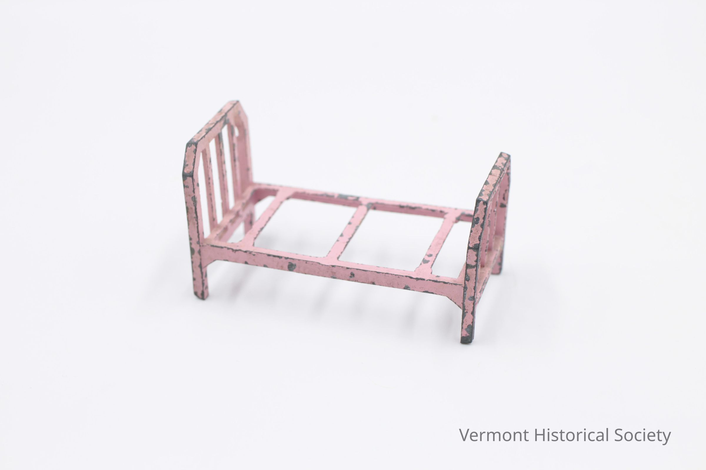 Miniature bedframe sized for a dollhouse. The bedframe is made of cast iron and painted pink. It consists of a headboard, footboard, and side rails. The headboard and footboard each have three vertical stiles, and the side rails are connected by three rails.Context