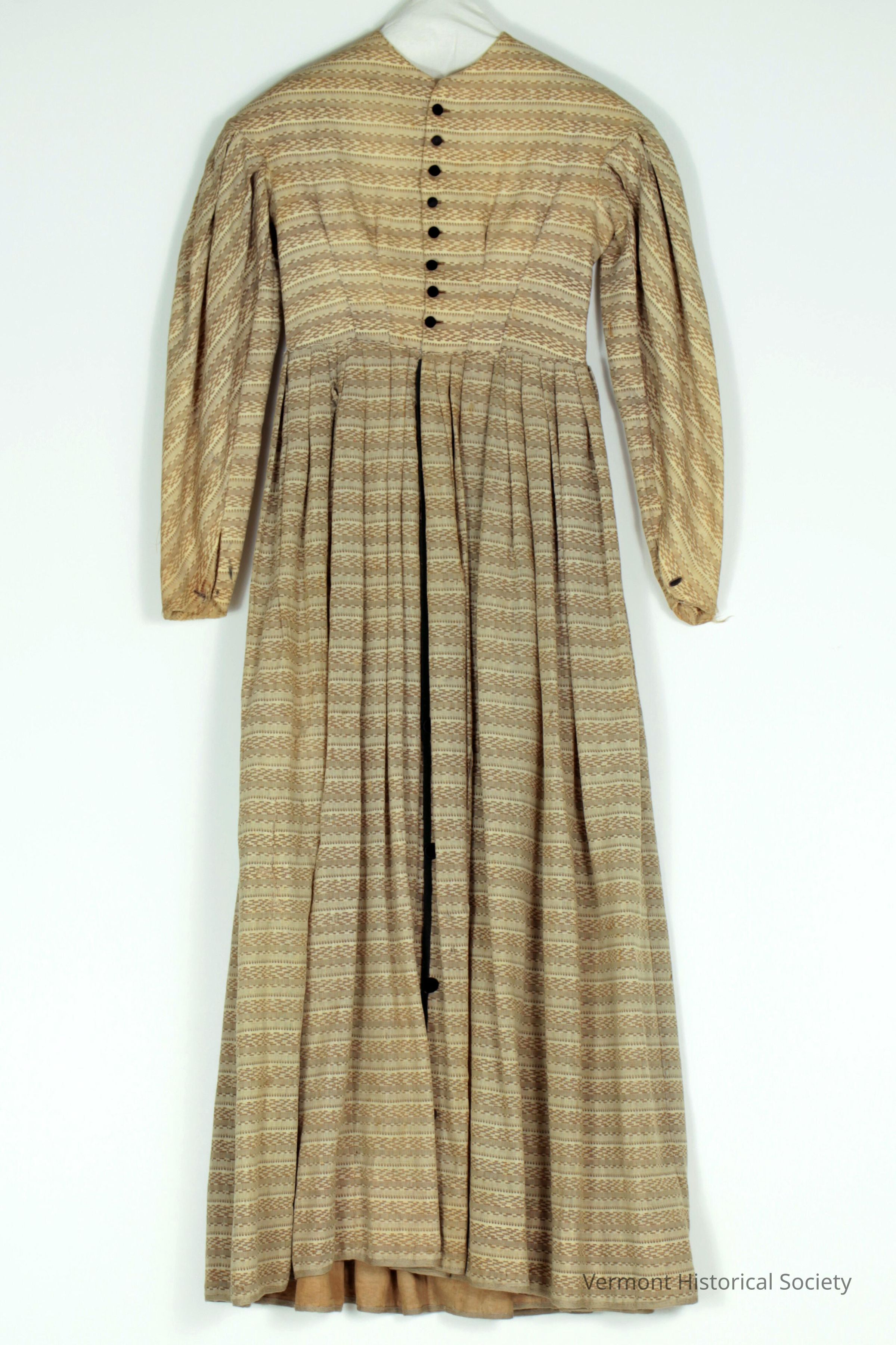Brown cotton dress. The fabric is in a faux ikat or faux knitted design of horizontal stripes in various shades of brown. The sleeves are set low in the should and gathered into the armscye. The bodice opens at the center front and secures closed with 8 velvet-covered buttons. The skirt attaches to the bodice with knife pleats.