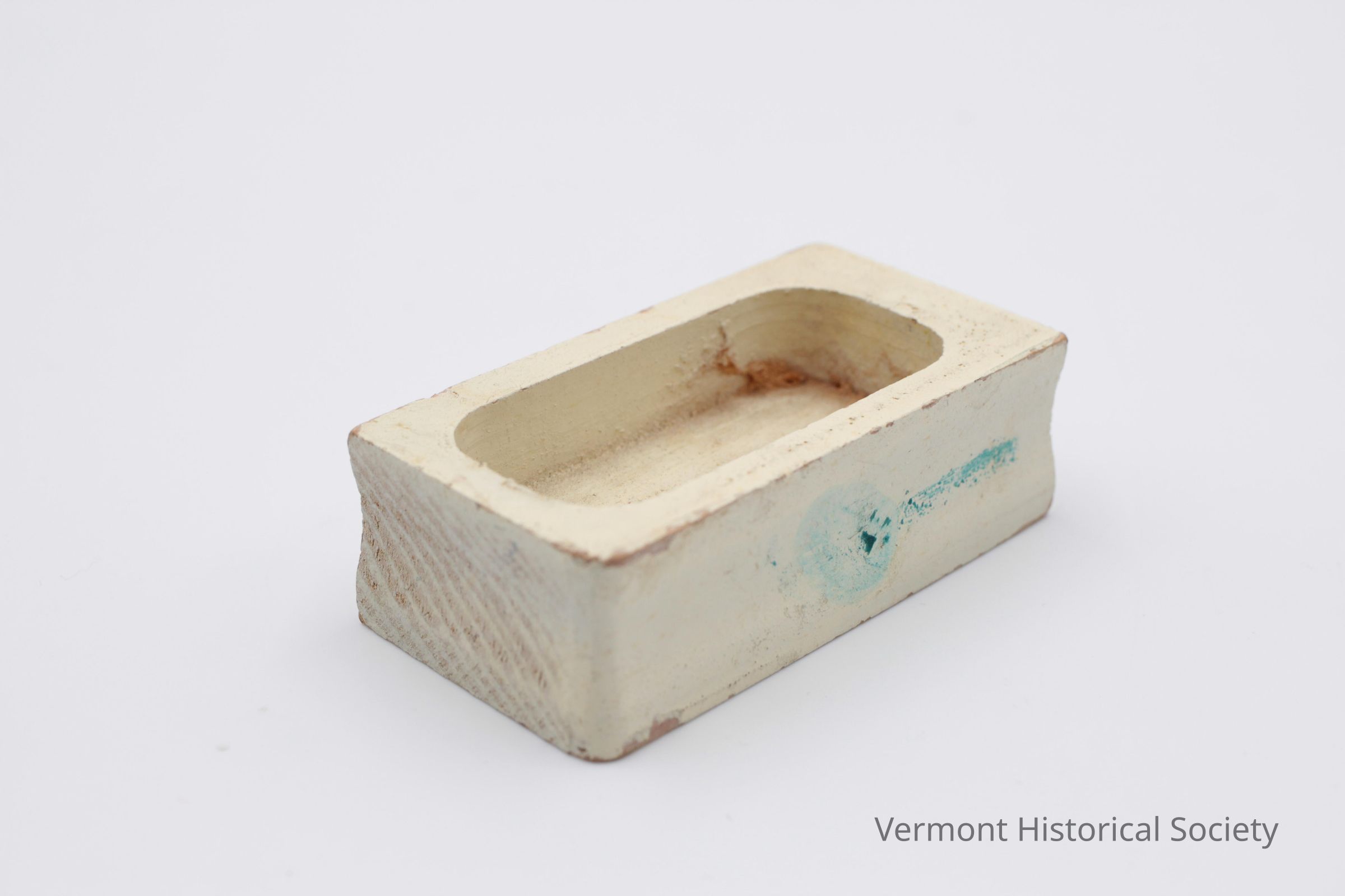 Miniature wooden bathtub sized for a dollhouse. The bathtub has two straight exterior sides, for sitting against a wall, and two slightly curved exterior sides. The interior has an oval cutout. It is painted white, with a line of blue paint transfer on one side.Context