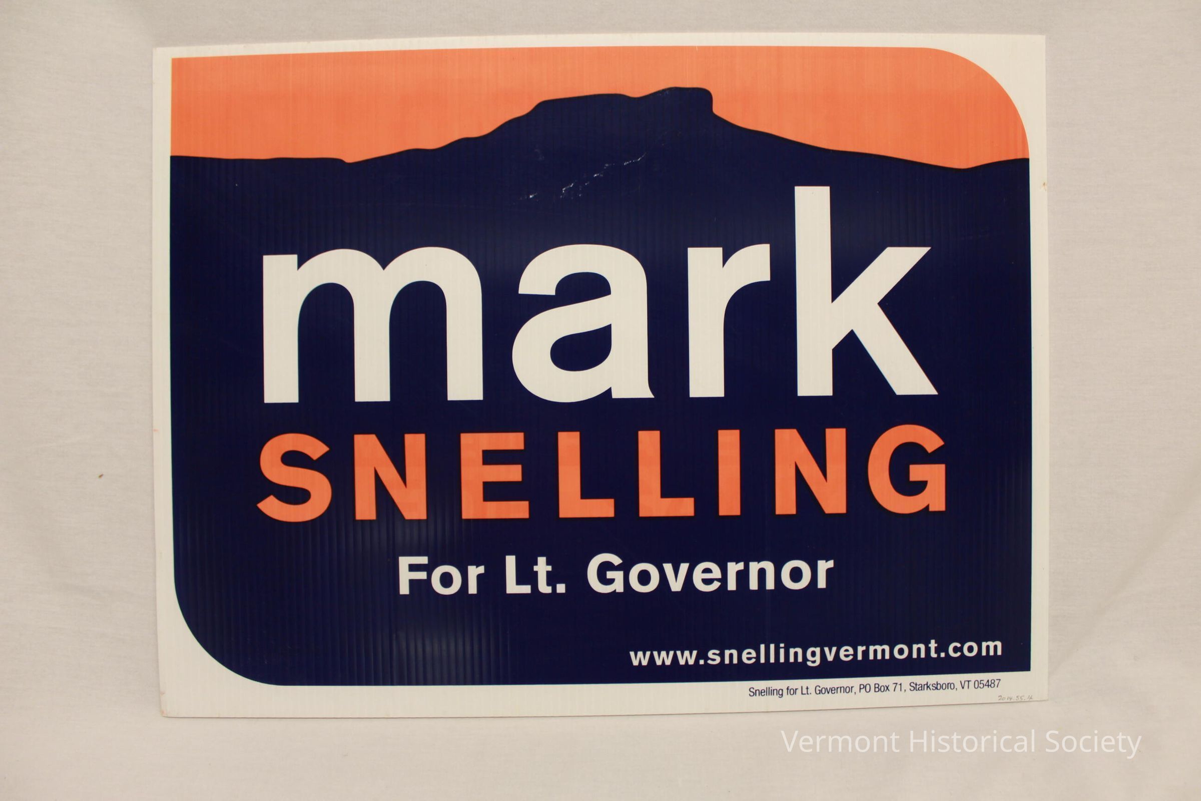 White corrugated plastic yard sign printed on both sides with a blue silhouette of Camel's Hump Mountain over an orange side. The top right and bottom left corners of the image are rounded. Above the image is the inscription, "mark SNELLING For Lt. Governor www.nellingvermont.com" in white and orange letters.