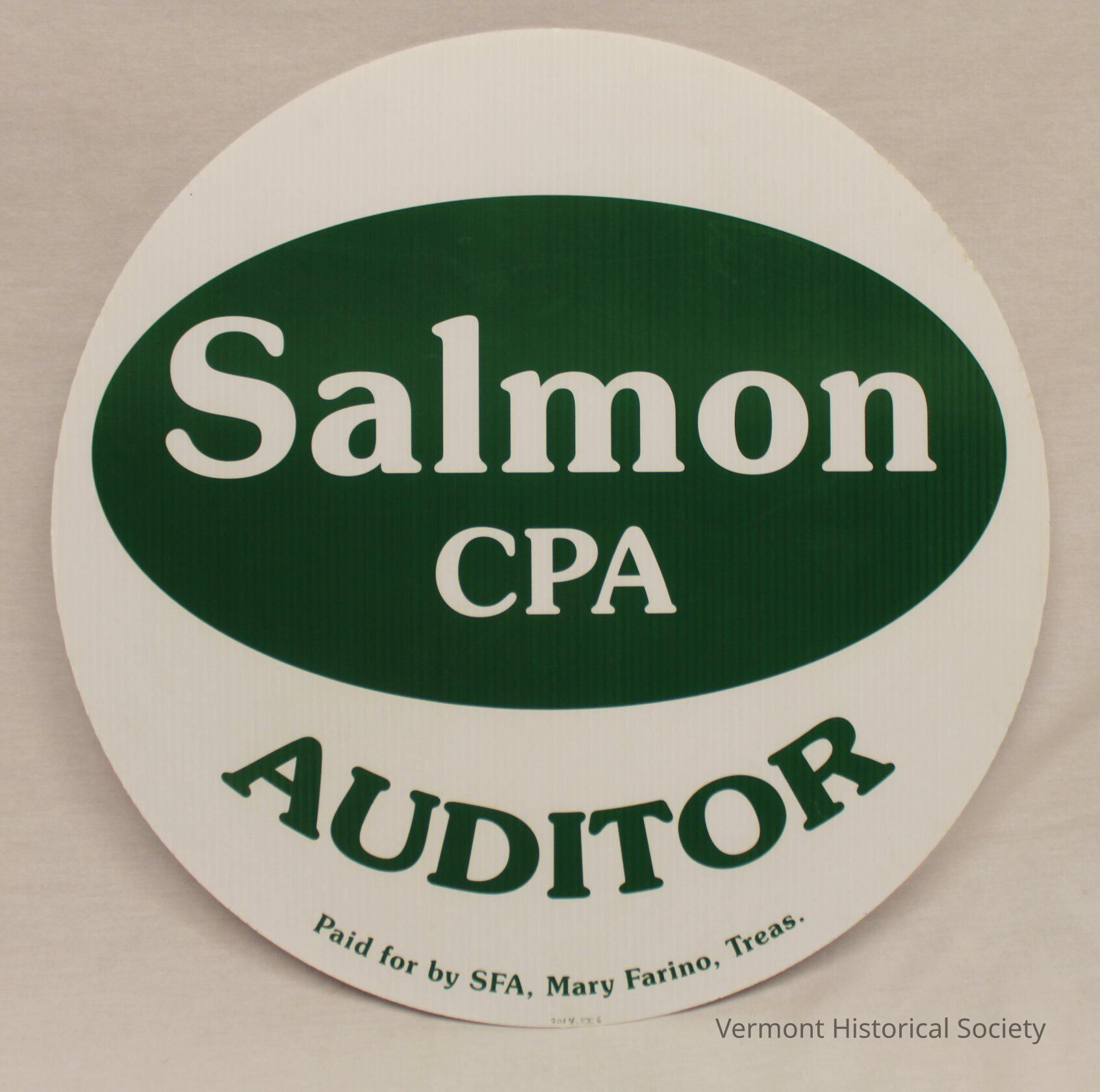 Round white corrugated plastic sign printed on both sides with the inscription, "Salmon CPA", within a green oval. The word "AUDITOR" arches beneath the oval, and the words, "Paid for by SFA, Mary Farino, Treas." ring the bottom edge is small letters.Context