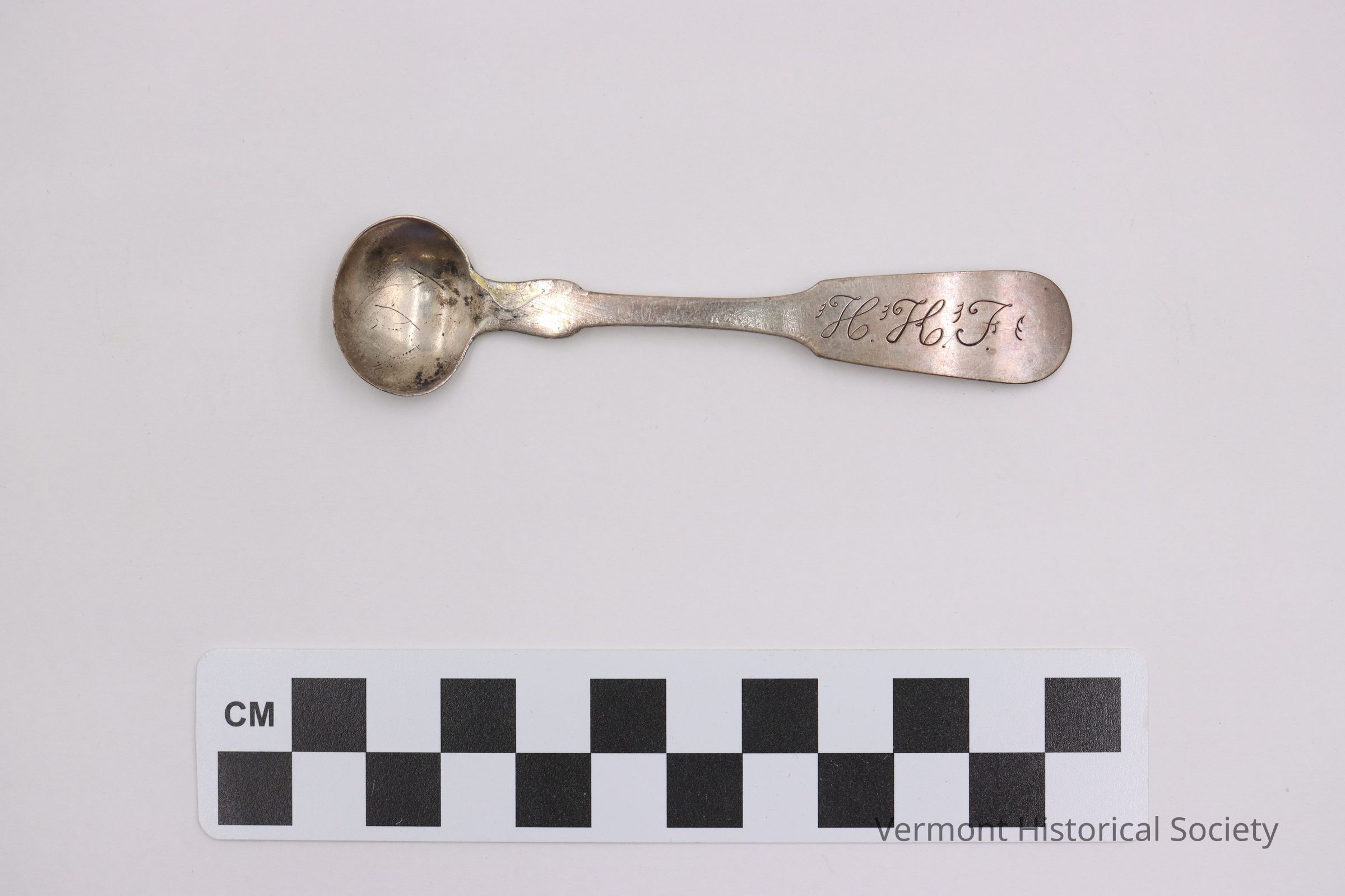Ladle-shaped salt spoon with the initials "H.K.F." engraved on the handle. The reverse of the handle is stamped with the mark, "A. Sanborn".
