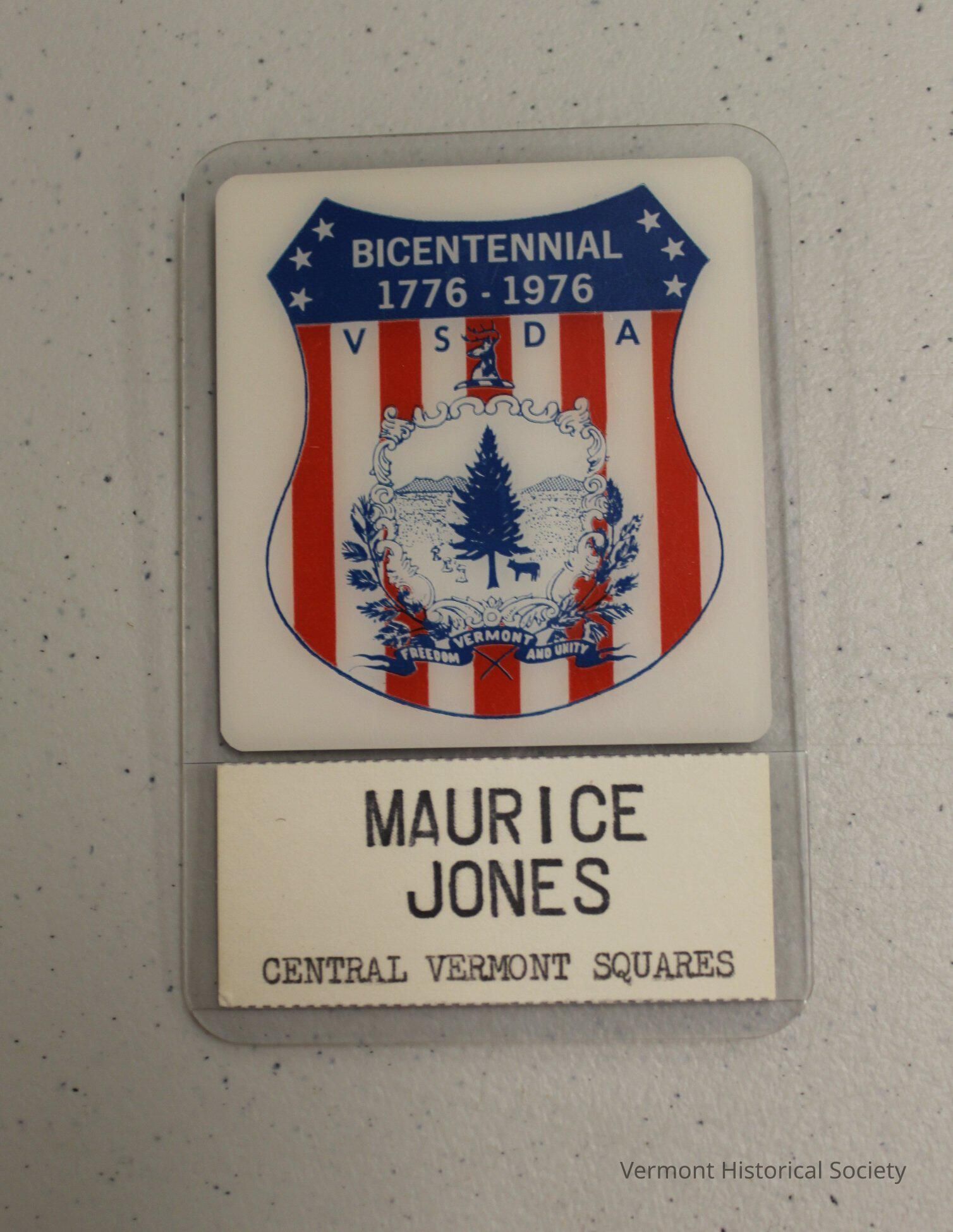 Nametag encased in plastic holder. The nametag is in two parts: a piece bearing a logo, and a smaller piece with perforated edges printed with the name, "MAURICE JONES" and the group, "CENTRAL VERMONT SQUARE". The logo, printed onto the top portion, is in the shape of a shield that is blue at the top and red-and-white striped on the bottom. The Vermont state seal is printed onto the striped portion of the shield, and the inscription, "BICENTENNIAL 1776 - 1976 V S D A" is at the top. There is a safety pin back at the center top on the reverse, and the maker's label, "Wester Plastic Products / 1701 Magnolia Avenue P.O. Box 1429 / Long Beach, Calif. 90801 (213) 435-4881 / Patent No. 2.364.870."Context