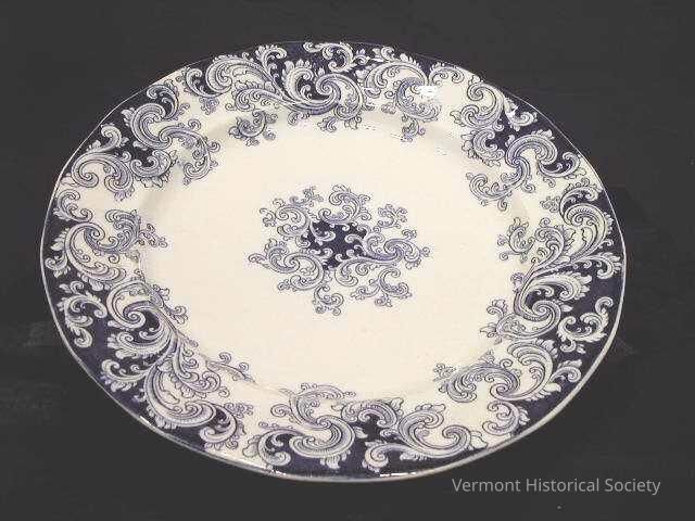 Blue-and-white transfer-printed plate. The plate is decorated with a a swirling design around the border and at the center. The back is labeled "GRANITE CHINA WR.S.&Co." There is a rectangular sticker on the back with the handwritten note, "Ms. Appleton Twitchell (Lucretia Rugg)".