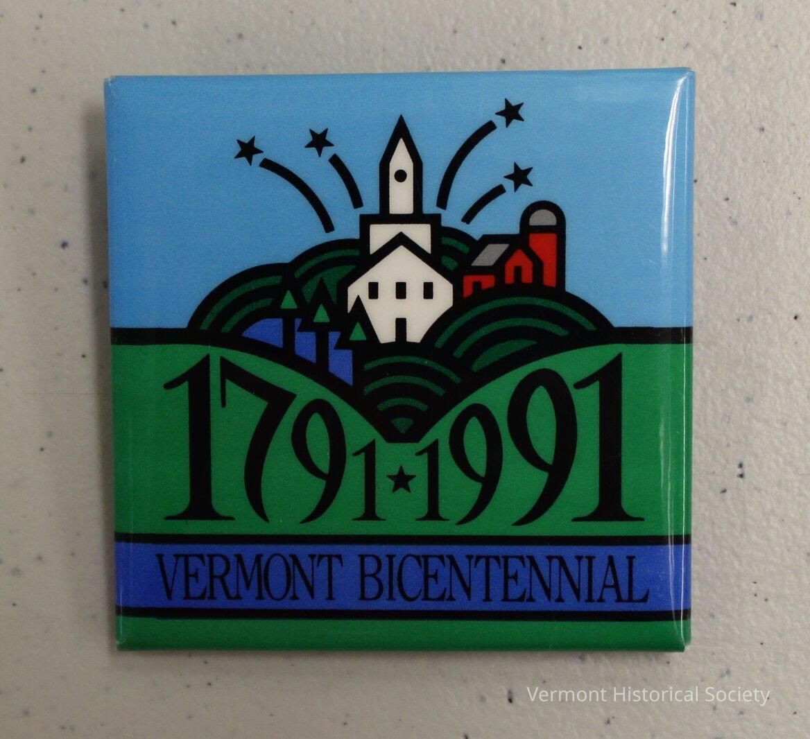 Square button printed with a simplistic, folk-art style image of a town in hills showing a church and a barn. The dates 1791 and 1991 are beneath the image, following the shape of the hills. The words, "VERMONT BICENTENNIAL" are printed within a blue rectangle across the bottom.Context