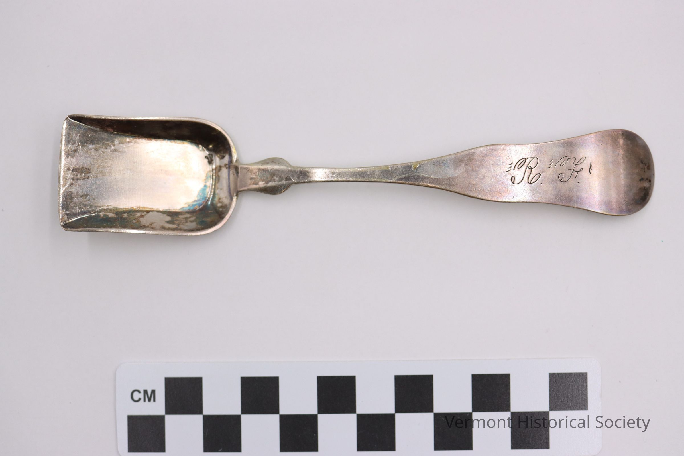 Sugar spoon with a shovel-shaped bowl. The front of the handle is engraved with the initials "R.F." The back of the handle is stamped with the mark, "H.M NICHOLS".