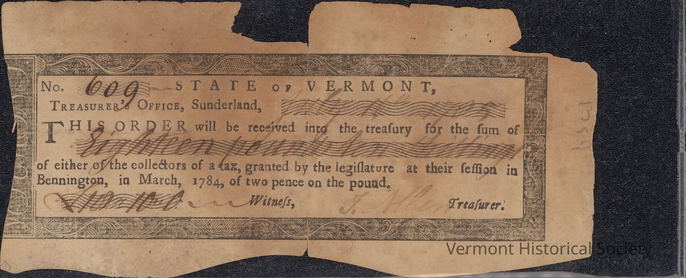 Paper scrip with the inscription, "No. [609] State of Vermont, Treasurer's Office, Sunderland, [July 16th, 1785]. This Order will be received into treasury for the sum of [Eighteen pounds ten shillings] of either of the collectors of a tax, granted by the legislature at their session in Bennington, in March, 1784, of two pence on the pound. Witness, [I. Allen] Treasurer."Context