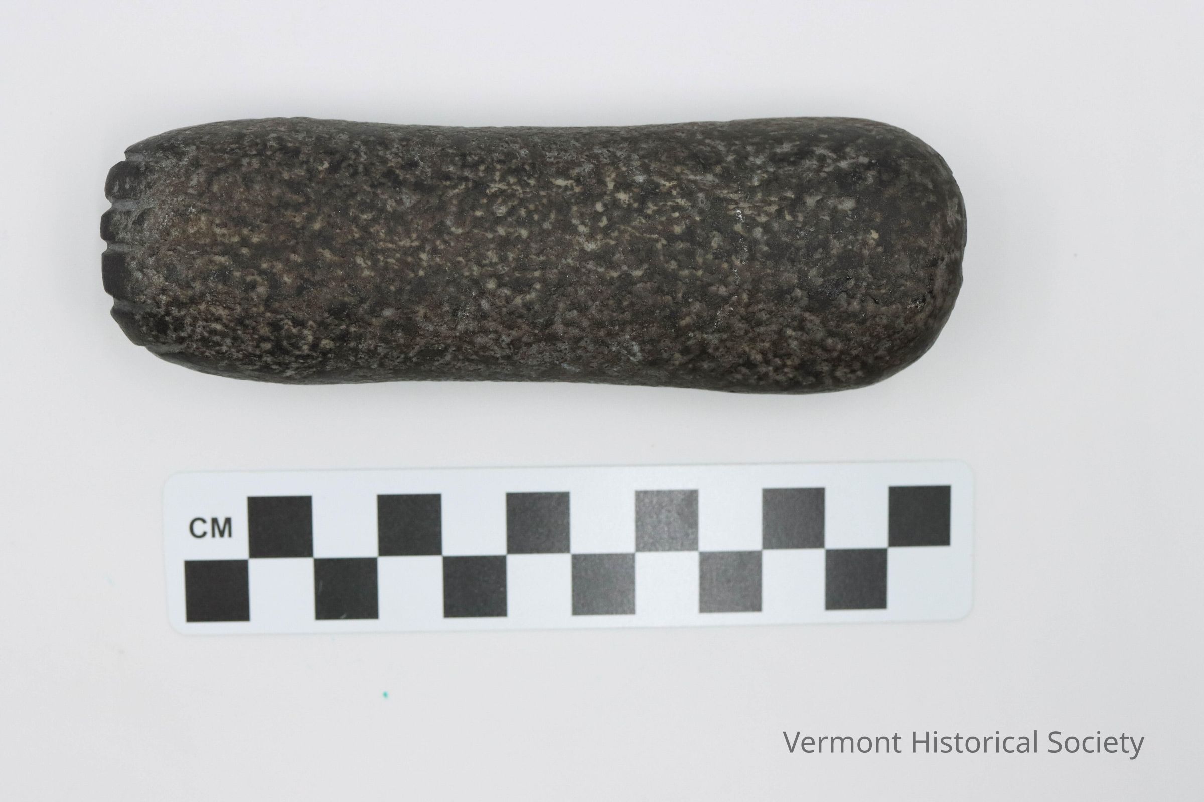 Ground stone gouge. It has a pecked surface. One end has shallow grooves and is polished. The opposite end has 5 deeply incised lines.Context