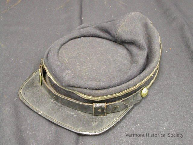 Blue wool forage cap with leather-covered front brim. There is a leather strap across the front, held on either end by brass buttons impressed with the Vermont state seal. There is a black ribbon edged in gold around the base of the hat.