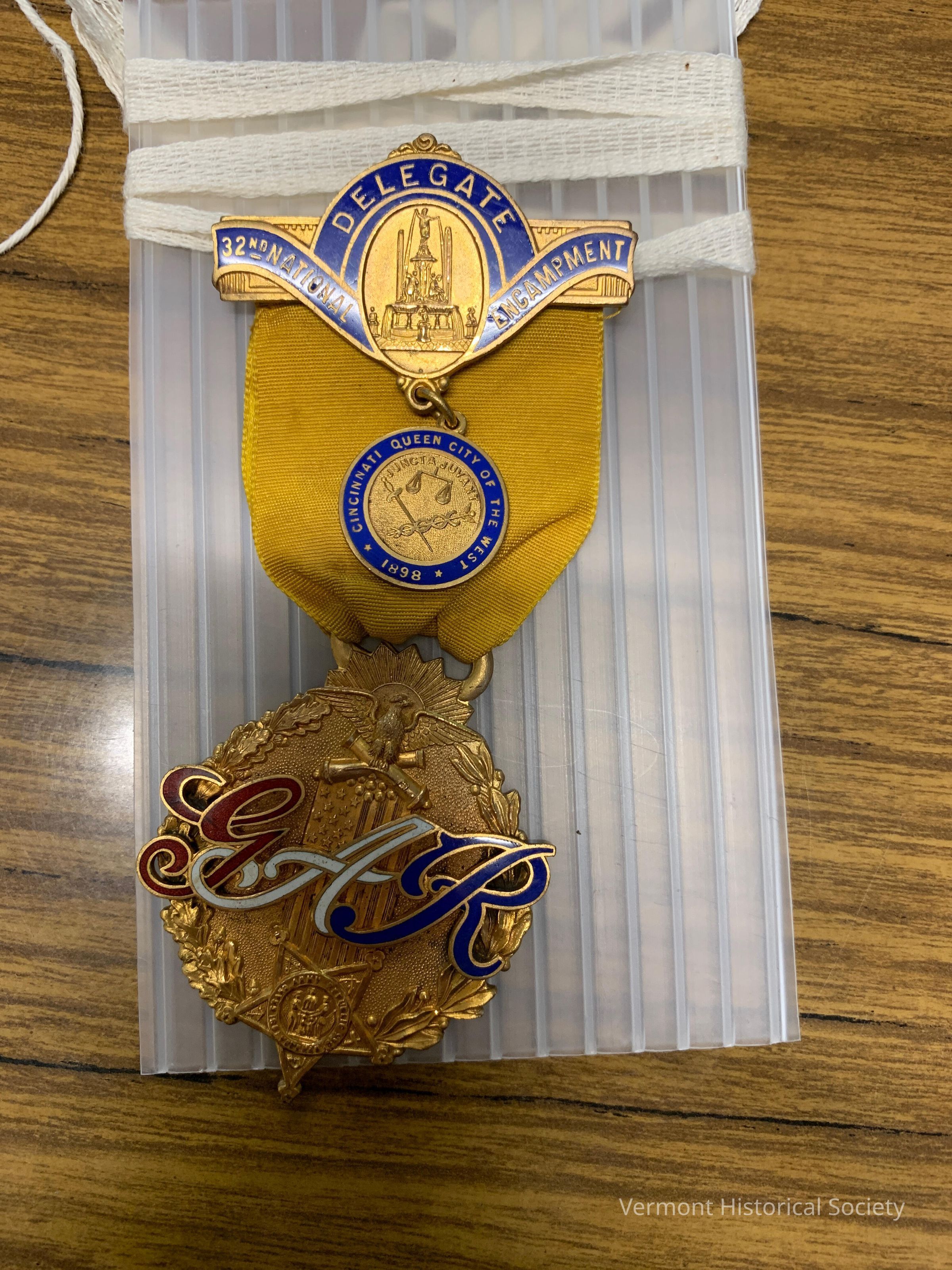 Membership ribbon consisting of a bar, ribbon, and medallion. The bar is molded with an image of a tiered fountain or centerpiece surrounded by the enameled inscription, "DELEGATE 32ND NATIONAL ENCAMPMENT". A small round medallion hangs from the bar and is molded with a sword, scales, a caduceus and the words, "JUNCTA JUVANT" surrounded by the enameled inscription, "CINCINNATI QUEEN CITY OF THE WEST 1898". The ribbon is gold. A large gold medallion hangs from the ribbon and is molded with a GAR membership ribbon beneath the raised letters, "GAR", which are enameled red, white, and blue.Context